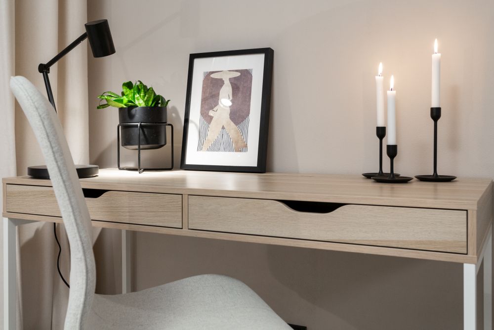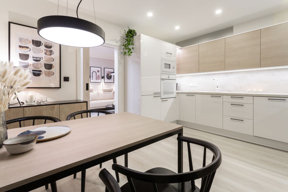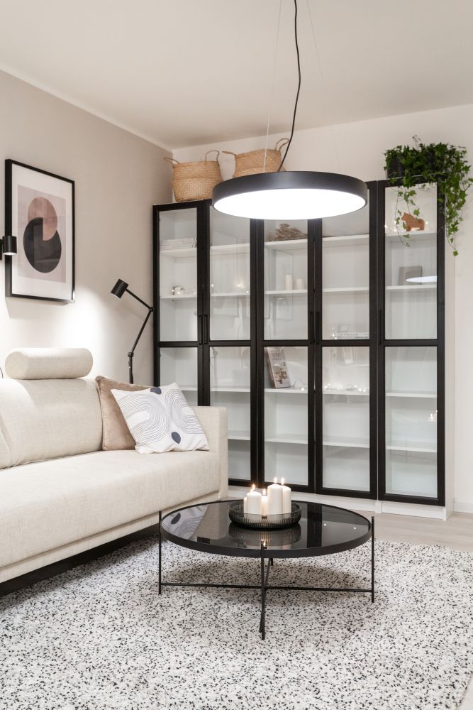 Kuchyň protepluje kombinace s dřevodekorem. Knihovny v pokoji a skleník v kuchyni ozvláštňují černé rámy ladící s podnoží jídelního stolu, která je vyrobená na míru. Deska stolu je ze stejného materiálu jako dvířka horních kuchyňských skříněk, čímž je stůl nenásilně propojený s kuchyní. Komoda v jídelně na ně navazuje dřevodekorem dvířek a černým korpusem. Také jídelní židle, konferenční i odkládací stolek a designové relaxační křeslo v pokoji jsou kompletně černé. Černá barva se prolíná celým bytem a objevuje se i na doplňcích: rámech plakátů, polštářích a drobných dekoracích, kde hraje roli akcentu.