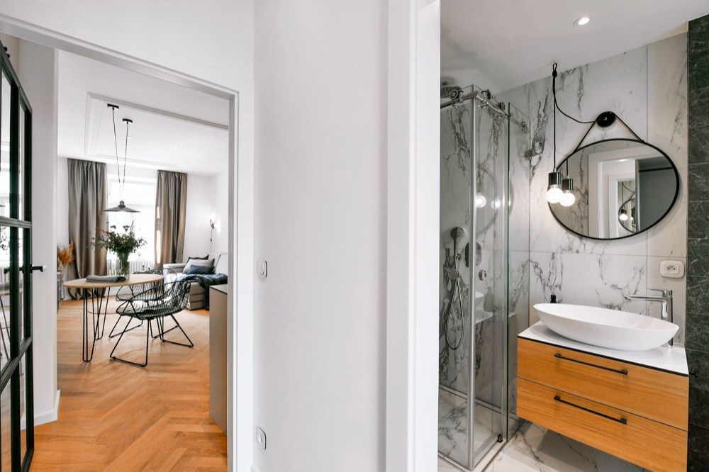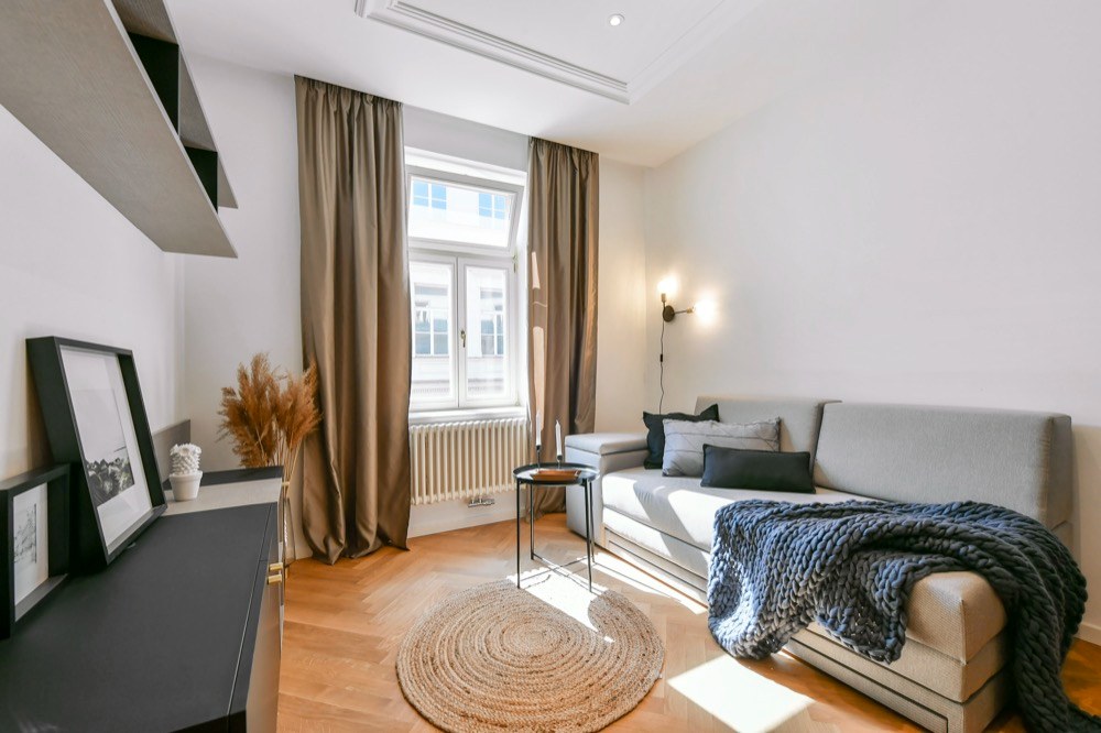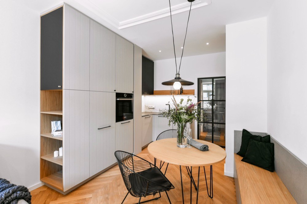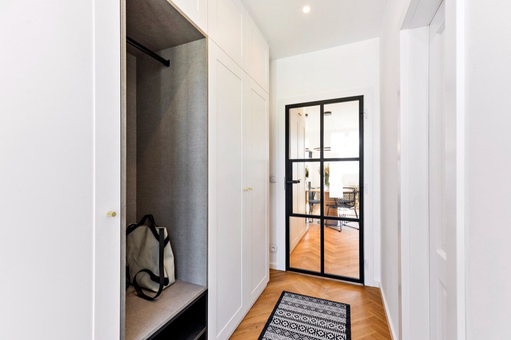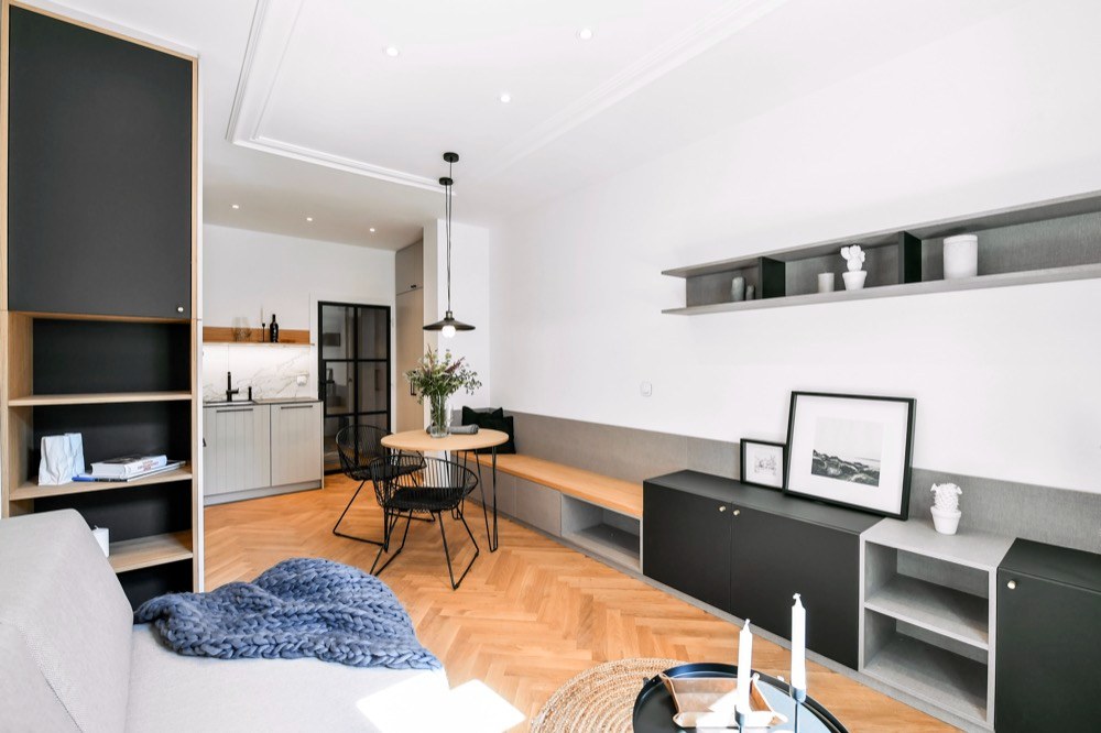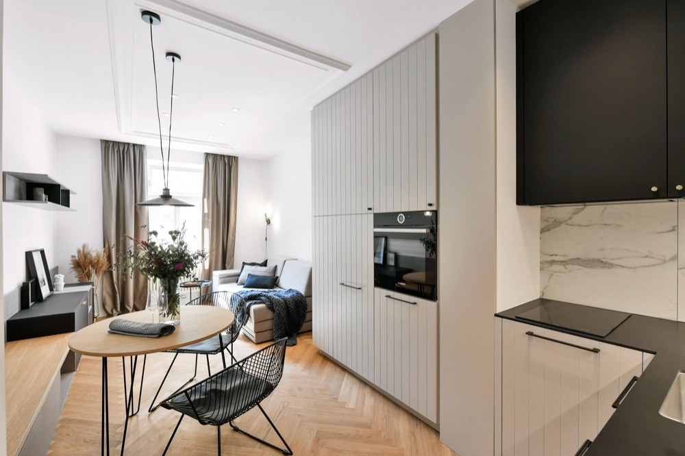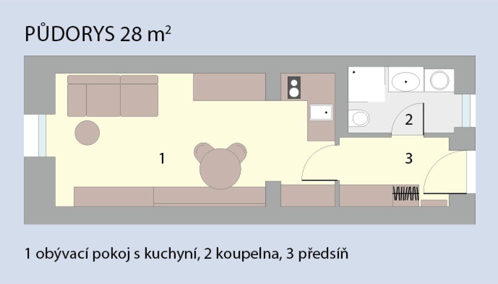 V rámci kompletní rekonstrukce se měnila i dispozice celého domu. Protože majitel chtěl byty pronajímat, na každém patře se z bytů vytvořilo několik garsonek, které jsou pro tyto účely výhodnější. To je i náš případ, kdy se jeden byt předělil napůl a vznikly dvě garsonky s dispozicí 1+kk s užitnou plochou 28 metrů čtverečných. Vzhledem k neutěšenému stavu objektu se v bytech nedalo zachovat nic původního. Přesto jsem chtěla udržet původního ducha domu, a tak jsem se snažila do objektu začlenit alespoň několik tradičních prvků, které jsou pro dům typické. Proto se do interiéru pokládaly parketové podlahy, dělaly se repliky vchodových dveří a kvůli požadavku památkářů také nová okna s původním vzhledem. Historizujícím prvkem jsou i štukové lišty, které lemují mírně snížený podhled, jenž se dělal kvůli rozvodům elektroinstalace. Požadavky od developera byly pro mě celkem standardní, a to vytvořit bydlení, které se bude líbit všem. Proto jsem vybírala především tradiční materiály a neutrální barvy. Na podlaze jsou položené nové dubové parkety, které jsou pro starší činžovní domy typické. Nábytek je vyráběný truhlářem na míru z masivního dřeva. Umělé materiály jsou využité pouze v podobě kompaktního laminátu na pracovních deskách. Kámen nebylo možné použít vzhledem k jeho vysoké ceně a požadavku na nižší náklady. Kuchyňská dvířka jsou pokrytá fólií na frézovaném podkladě. Barvy jsou v celém interiéru neutrální, aby si je mohli budoucí nájemníci libovolně doplnit třeba dalšími barvami. Koupelna je obložená keramickými obkládačkami v imitaci mramoru, pořízenými ve studiu Archtiles, umyvadlová skříňka je vyráběná na míru od truhláře. Zajímavým a výjimečně ne původním prvkem jsou industriální kovové dveře mezi předsíní a hlavní obytnou místností. Dávaly se kvůli prostupu světla do chodby.