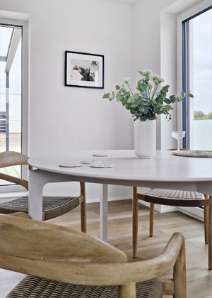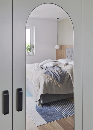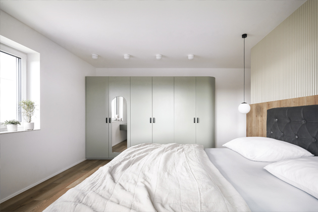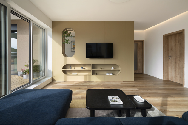 Museli jsme se přizpůsobit neměnným nebo obtížně ovlivnitelným tzv. standardům. I přesto, že dispozice, proporce a velikost místností a oken byly dány a výběr podlahy a dekorů dveří byl omezen na pouhých několik vzorků, dokázali jsme vytvořit plynulý průchod ze vstupního zádveří díky umístění skrytých posuvných dveří, které interiér nijak nezatěžují. Značnou výzvou se stal obývací pokoj, jenž v podstatě slouží jako vstupní hala, odtud vedou čtyři dveře, průchod do kuchyně a dvě prosklené stěny směřující na terasu. Díky šikovnosti našeho dodavatele jsme úspěšně zrealizovali nábytkovou příčku s malým otvorem, který umožňuje pohled do kuchyně. V původním návrhu developera byl pilíř široký pouze asi třicet centimetrů.