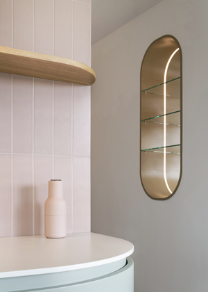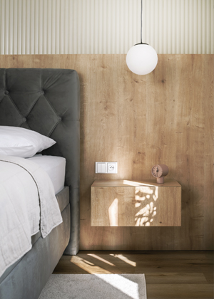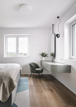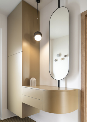 Převážná většina dalších materiálu jsou lakované dřevovláknité desky MDF. Lakovaný povrch umožnil vybrat z NCS vzorníku téměř jakoukoli z 1 950 barev, což nám nabízelo širokou škálu možností. Při nanášení laku nevzniká riziko viditelného oblepení hrany, odlupování a barva zůstává konzistentní po celém povrchu. Celkový dojem a provedení působí velmi elegantně. Pro dosažení maximální harmonie jsme nechali na míru vyrobit nábytek, který působí jako kusový, a to hlavně proto, aby korespondovaly detaily jeho provedení a barevnost. Z hlediska velikosti prostoru nebylo vždy nutné využívat veškerý prostor do posledního milimetru, proto jsme si i mohli dovolit nechat některé kousky vyniknout.