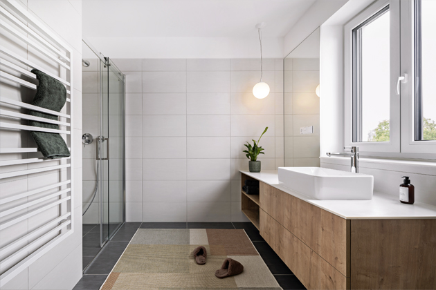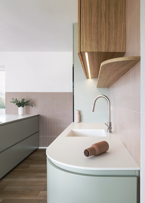 Tenoučká deska v kuchyni, koupelně a na parapetech u všech oken je vyrobena z velmi praktického a elegantního umělého kamene corian, který se skvěle přizpůsobí jakémukoli tvaru a zkušení řemeslníci z něj vyrobí téměř cokoli. My jsme jeho vlastnosti využili k vytvoření odolných a antibakteriálních povrchů. Na rozdíl od jiných materiálů tohoto druhu a síly lze corian také opravit. Jeho největší hodnotu lze vidět na pracovní desce spojené s dřezem v kuchyni, která je vybroušena v jednom kusu a spojena bez jediné spáry.