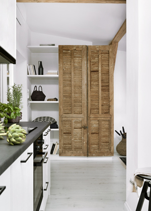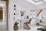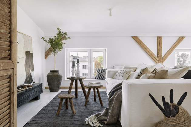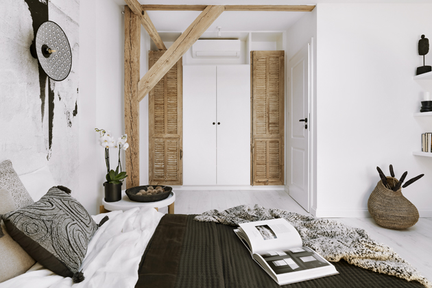 Celému prostoru dnes bez nejmenších pochybností panuje velmi lehká barevná paleta soustředěná kolem bílé, do které autoři neváhali vstoupit černými akcenty. Kontrast pak zjemnili dubovým dřevem, které nenápadně prostupuje celým bytem a ochotně jej uzemňuje. Právě díky tomu se Attic Art může pochlubit velkoryse středomořskou atmosférou se subtilním dotykem etno stylu. Pomyslnou korunu pak interiéru dodává hned několik impozantních kousků s bohatou historií – například rozměrná váza, televizní stolek z opálených trámů i masivní dřevěné stolky. Vedle na první pohled patrné severské střídmosti, pozorovatelné právě v přítomných barvách a tvarech, však byt nemůže zapřít ani exotický akcent Orientu a Afriky.
