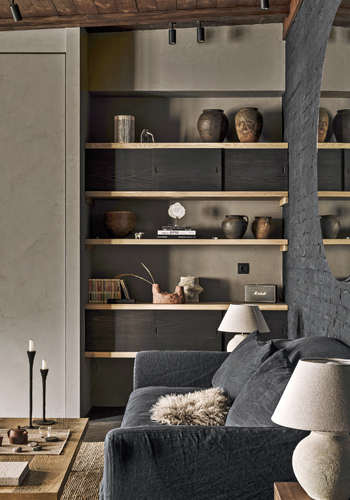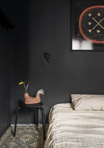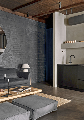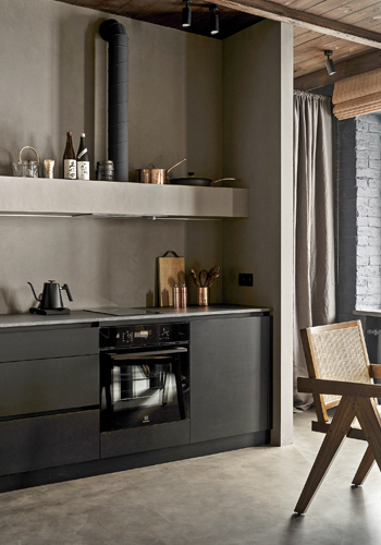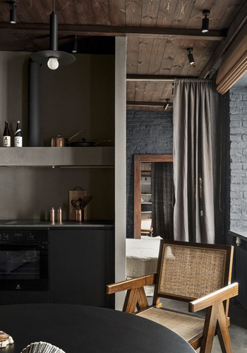 Společně s vhodně zvolenými tvary a materiály však byt nepůsobí nijak stísněně. Díky tmavým stěnám i stropu vypadá až nečekaně prostorně. Povrch podlahy tvoří hladký mikrocement, který společně se stěnami a dvířky úložných prostor i kuchyňské linky tvoří efektní pozadí pro použitý nábytek a dekorace s výraznou texturou. Autorský dřevěný čajový stolek, masivní židle s ratanovým výpletem, výrazné dřevěné police, bambusové rolety i hrubý přírodní koberec mají na téměř černé kulise příležitost skutečně vyznít. Olga Fradina s oblibou vytváří nadčasové kombinace zdánlivě neslučitelných stylů. V tomto případě vsadila na neotřelou kombinaci etnostylu s modernismem, protkanou detaily s orientální atmosférou.