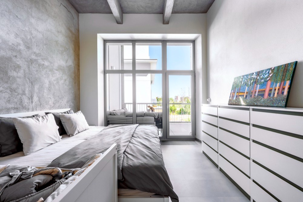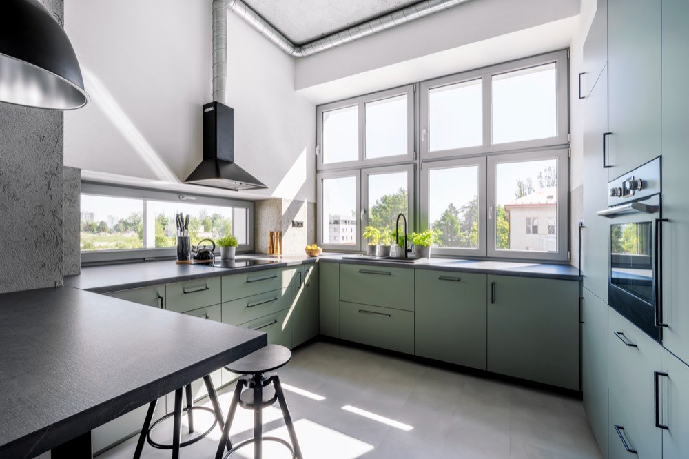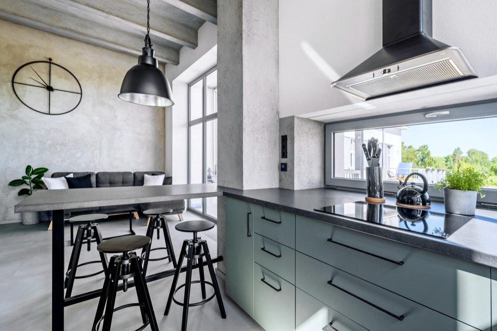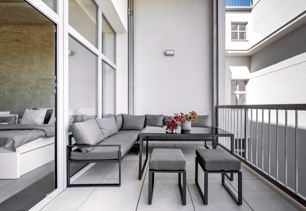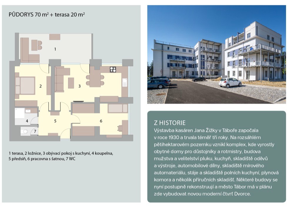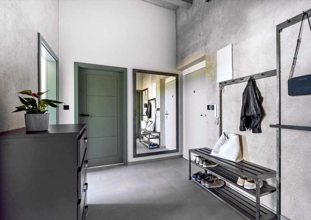 Po rekonstrukci se dům kasárnám vůbec nepodobá. Byl osekán na skelet, přibylo další patro a získal kovové vzdušné terasy, které částečně lemují fasádu. Jeden z jeho bytů si koupila Pavlína s Jakubem a okamžitě se do něj zamilovali. Jakmile do bytu vešli, uchválily je stropy vysoké 3,70 metru a celkově netypický „masivní“ vzhled budovy. Jediné, čeho se báli, byla orientace bytu na sever, ale to se časem ukázalo jako zbytečné. Velká okna vpouští do interiéru dostatek světla a radiátory společně s konvektory v podlaze byt v pohodě vytopí. Při hledání stylu se majitelé inspirovali ve skandinávských zemích, kam hodně cestovali. Hlavně Kodaň jim přišla úžasná svým industriálním stylem. Hezky se jim to i propojilo s původním využitím objektu jako kasáren. Odtud také pramení použití zelené barvy na kuchyni, dveřích a na některých prvcích. Se stavební firmou Stav Styl (www.obkladystyl.cz ) se Pavlína s Jakubem domluvili, že se beton na zdech nechá tak, jak ho firma nahodila, akorát požadovali, aby na zdech zůstala patrná stopa stěrky. Povrch potom Jakub s kamarádem ošetřili bezbarvým matným lakem. Spolu s vysokými stropy tak vznikl slušný základ pro industriál.