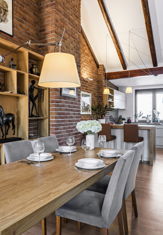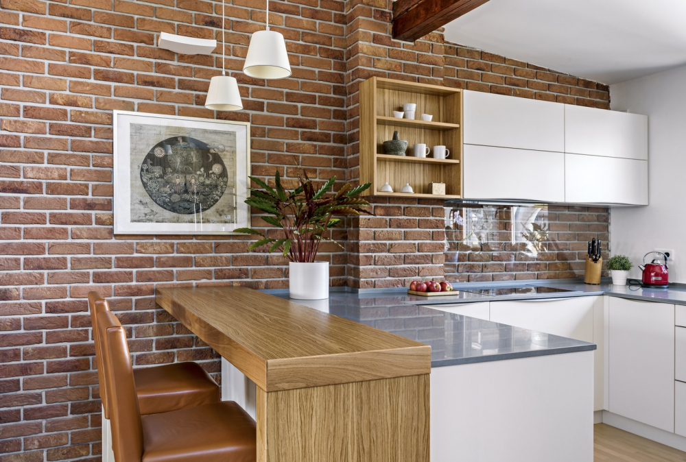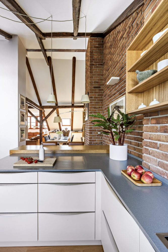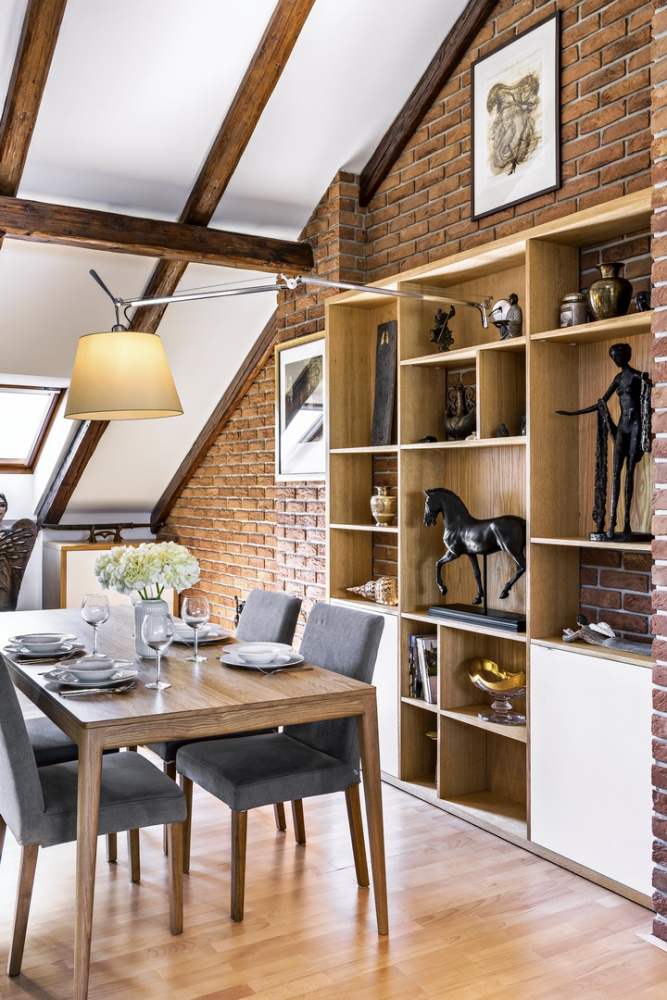 Při tvorbě barevného konceptu vycházela designérka z toho, co už bylo v bytě pevně dané, tedy z původního odstínu dřevěné podlahy a trámů. Dominantním pěkným prvkem je i cihlová zeď, k níž bylo třeba nové vybavení také dobře sladit. K tomu všemu musely být použity především teplé tóny. Na nábytek tedy zvolila dubovou dýhu, jejíž barva a struktura se vším pěkně ladí.