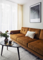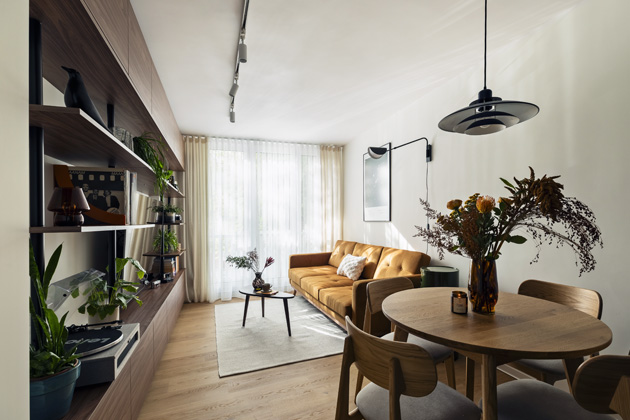 Investoři se stěhovali z menšího bytu a jedním z jejich zásadních požadavků tak bylo, aby každá místnost měla jasně definovanou funkci. Vysoká očekávání měli také od estetické stránky svého nového bytu – zhlédli se ve stylu mid-century, který perfektně korespondoval i s modernistickou podstatou budovy, a s designérkou si tak skvěle notovali. Z původního interiéru zůstala pouze dispozice – kompletní zařízení bylo vybráno nově a v souladu s potřebami života ve 21. století. Do bytu se přitom vešly hned tři pokoje, koupelna a samostatná kuchyň.