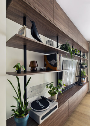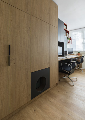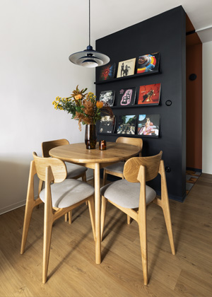 spirovaná vintage nábytkem, jež pokrývá celou stěnu. Součástí prostoru se stal i stylový jídelní kout ohraničený černou stěnou s úzkými policemi, na kterých se usídlily vinylové desky. Jedním ze zásadních požadavků ze strany majitelů byla také samostatná pracovna. Oba pracují z domova, a tak potřebovali vytvořit prostor odpovídající jejich pracovnímu nasazení. Do jedné z obytných místností proto designérka navrhla nábytkovou stěnu, která kromě dvou pracovních stolů ukrývá také prostornou knihovnu, pračku se sušičkou a zázemí pro kočičího mazlíčka. V poslední z obytných místností se nachází ložnice, jež i přes skromnější podlahovou plochu zvládla poskytnout dostatek místa pro umístění postele i hluboké skříně v jasném odstínu tyrkysové.