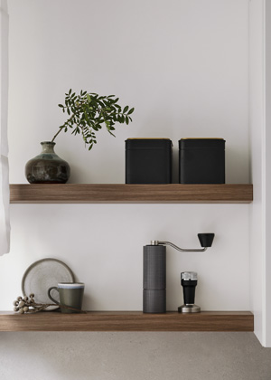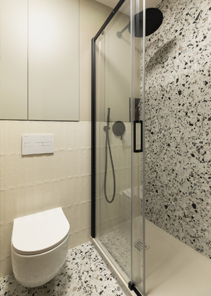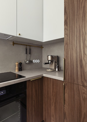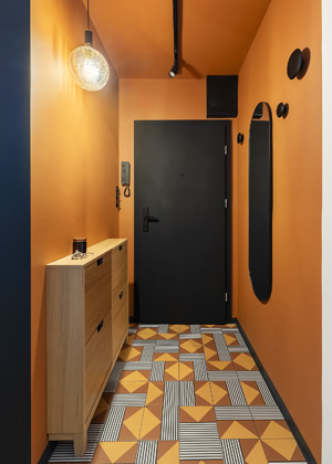 Jednotlivé místnosti propojuje vstupní chodba s velmi silným charakterem – podlahu zdobí ornamentální dlažba ve stylu bauhaus. Stěnám a stropu pak dodává silný výraz jasně oranžová výmalba, která dobře ladí s kubistickým členěním prostoru. V nepřehlédnutelném kontrastu k chodbě pak stojí oddělená kuchyň, která je co do barevné palety vůbec nejtlumenější částí bytu. Na zakázku vyrobenou kuchyňskou linku kryjí dvířka v bílém matném laku a ořechové dýze. Díky rafinovanému využití prostoru zvládá kuchyň i přes nevelké rozměry poskytnout ergonomický prostor pro vaření a nechybí ani kávový koutek, který vzniknul na přání investorů. Barevně umírněná je pak také koupelna – té dominují krémové obklady s výrazným teracem, které odkazuje k vintage estetice. Pod umyvadlo na míru vyrobená skříňka s originálními ornamentálními čílky dotváří osobitý charakter prostoru.