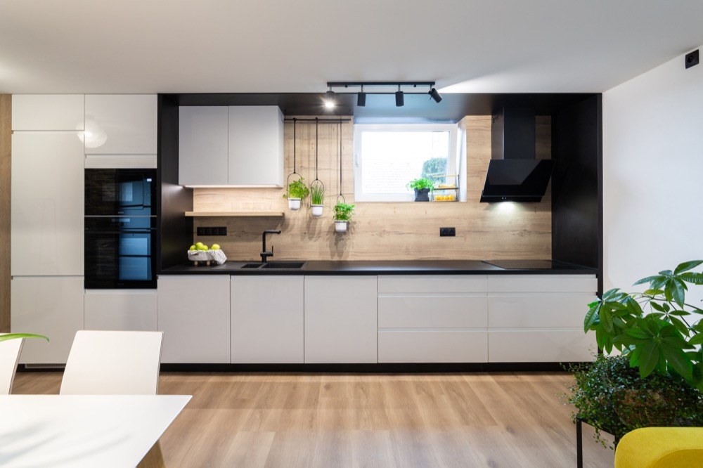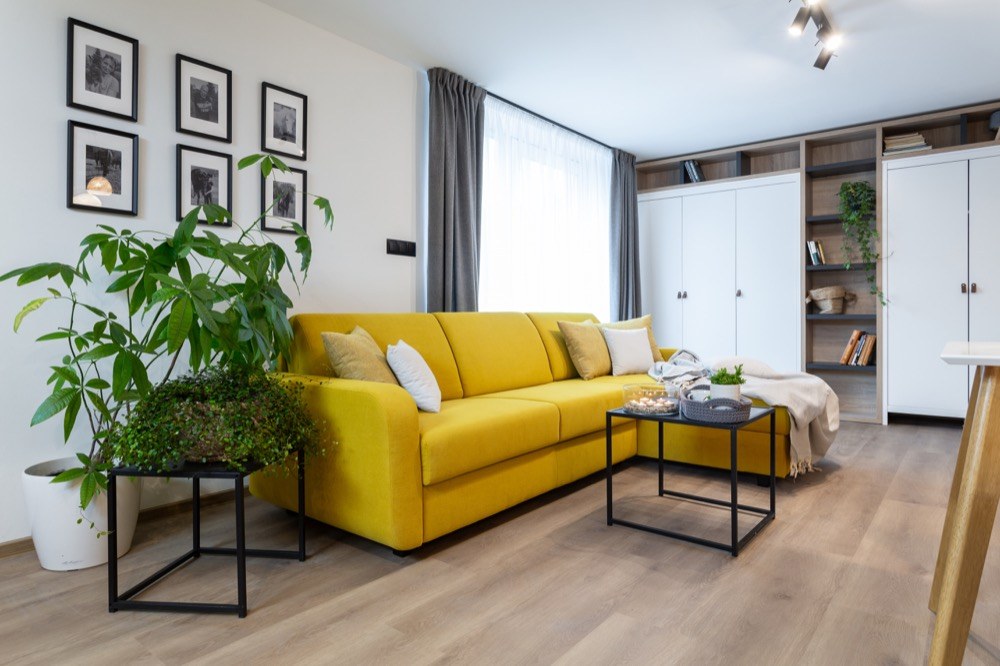 Styl jsme volili moderní a na přání Jaromíra s černými doplňky. Přál si bílo-černou kuchyň, černé doplňky v koupelně a útulno. Což věříme, že se povedlo. Útulno jsme navodili dřevodekory na podlaze a nábytku, lehčeným obkladovým kamenem na jedné ze stěn, pozitivně žlutou rozkládací sedací soupravou a spoustou rostlin, které vnesou do interiéru život. Koupelna spolu s dveřmi působí nadčasově, volili jsme dokonce černou sanitu. Opět ale s použitím prvku dřeva a zeleně tak, aby výsledek působil moderně a útulně. Krásně vynikne detail sprchové zástěny, která je ve stejném designu, jako jsou vstupní dveře koupelny, to znamená tenký černý rám a uvnitř tři skleněná pole. Výsledek působí až lehce industriálně. Skříně od našeho partnera nám náš pan truhlář doplnil o vertikální i horizontální police a knihovny tak, aby celek působil jako vestavná skříň. Ze skříně zajímavě vychází také TV stolek a pracovní místo pro paní Libušku, které jsme doplnili taburetem ve stejné barvě, jako má sedací souprava. Žlutá barva se tu a tam objevuje i na drobných doplňcích (žluté holínky, rukavice, žluté narcisky, vázička a talířek od partnera).