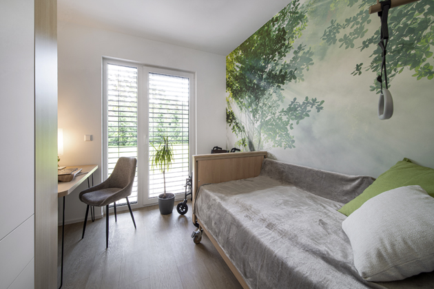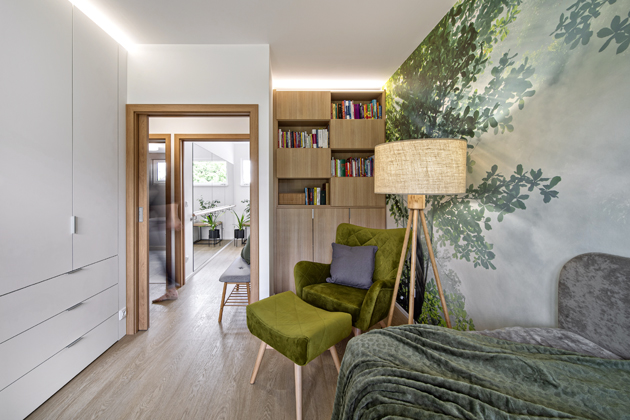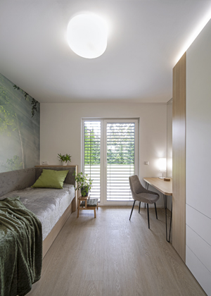 Co nejvíce jsme se snažily propojit s přírodou s ohledem na praktičnost a zátěž související s používáním invalidního vozíku a pojízdného zdravotního lůžka. Volily jsme proto laminátovou podlahu Gerflor v dekoru přírodního dubu, který do našich krajů prostě patří a působí velmi teplým dojmem. K tomu jsme následně ladily i interiérové dveře a dekor nábytku.