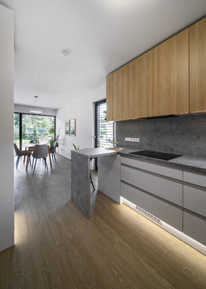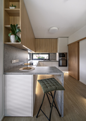 Kuchyň je opět navržena tak, aby se v ní mohl obsloužit i manžel s pohybovým omezením. Oproti klasické kuchyni je horkovzdušná trouba s mikrovlnkou v nižší úrovni. Pultík oddělující jídelní část je ponechán „průhledný“, aby se u něho při práci v kuchyni dalo komfortně posadit. Navrhly jsme otevřené police, kam si majitelé mohou vystavit oblíbené knihy a drobnější rostliny. Zároveň tvoří lehký a plynulý přechod mezi kuchyní a obývací částí.