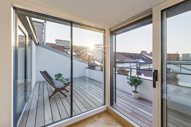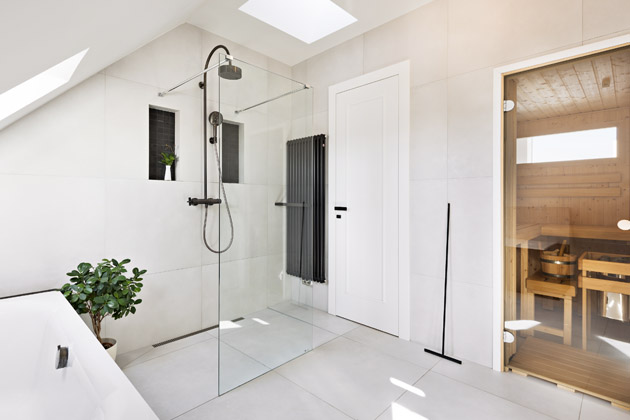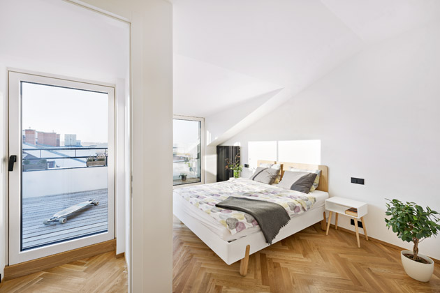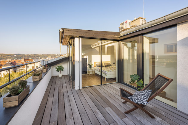 Právě sauna s terasou byly stěžejními prvky celé rekonstrukce, které bylo nutné řešit zejména z technického hlediska. „U sauny bylo nezbytné vyřešit odvod tepla a vlhkosti, což jsme provedli nuceným odvětráváním. Konstrukčně i legislativně největším oříškem celé přestavby byla terasa. Abychom mohli terasu co nejlépe propojit s interiérem, navrhli jsme zásah do střechy podkroví a vytvořili velkoplošné rohové zasklení ložnice. Jelikož se však činžovní dům nachází v památkové zóně, návrh jsme museli konzultovat s orgány památkové péče,“ vysvětluje architektka. Prostor terasy se tak téměř zdvojnásobil, ovšem úprava střešní roviny, vytvoření vikýře a velkého prosklení byly v rámci rekonstrukce velkou výzvou.