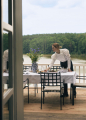 Francouzským oknem se vchází na terasu, kde může šéfkuchařka Tess servírovat zdravé pokrmy z biopotravin, které pro rodinu připravila. S výhledem na rybník obklopený lesem chutná o to víc. I venkovní jídelně dominuje velký stůl s několika židlemi. Jídelna je tentokrát z kovu, který zvládá pobyt na slunci i na dešti.
