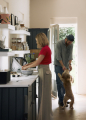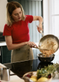 Veledůležitou místností v domě šéfkuchařky je kuchyň. Venkovsky laděný kuchyňský nábytek v dřevěném provedení s frézovanými černými dvířky se doplňuje s bílou mramorovou deskou s černým žilkováním. Do prostoru pod okny je situována pracovní deska s dřezem, do protilehlého ostrůvku je zapuštěna varná deska. Místo horních skříněk najdete v kuchyni otevřené police, kde je místo pro dózy na potraviny, ale i pro nejrůznější doplňky. Krásné měděné nádobí používá Tess k vaření, ale stejně tak mohou mít tyto kousky funkci doplňků.