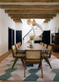 Venkovský charakter dávají prostoru odhalené dřevěné stropní trámy a masivní dřevěná podlaha, retro zastupuje prosklená kredenc a design sem vnáší svítidlo, koberec a doplňky. Zajímavým prvkem je obloukové schodiště vedoucí do patra domu. Na jídelnu volně navazuje obývací pokoj opět v příjemném mixu stylů, hodících se do tohoto stavení.