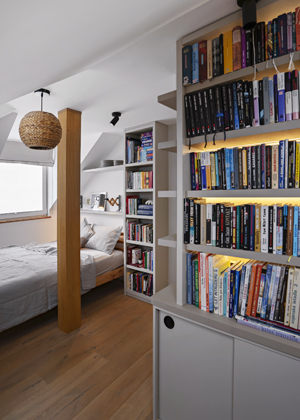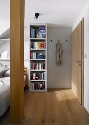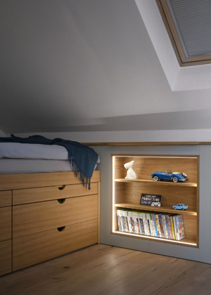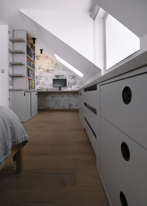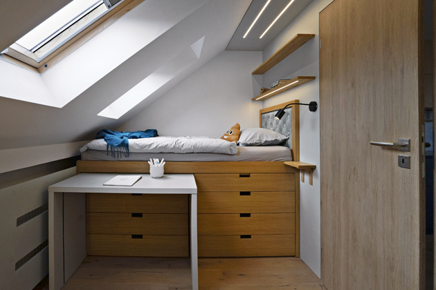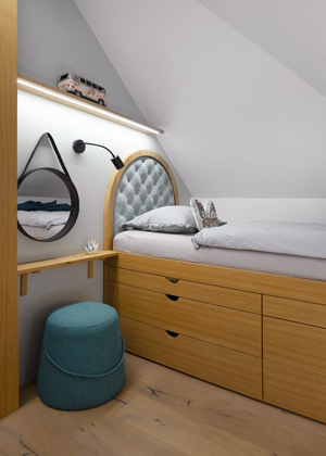 V dětském pokoji musela fantazie designérky vzlétnout do výšin, aby na devíti metrech čtverečních, a navíc se šikminou vykouzlila oázu pro dva sourozence. Lůžka umístila na vyvýšená místa, pod kterými se skrývá šatna a v jednom bloku i vysouvací psací stůl. Dívčí stranu pokoje pojala ladněji v křivkách, zatímco chlapecká dostala více pravoúhlé vyznění. Oba spací kouty příjemně zútulňuje polstrování v dubových rámech umístěné za hlavou.