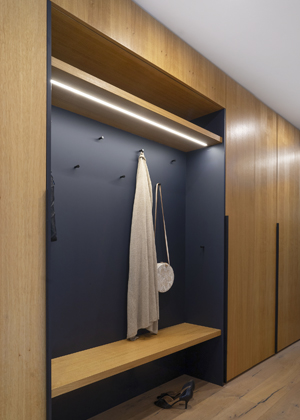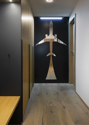Na samotném začátku se designérka zaměřila na kuchyň a vstupní chodbu, kde se začal rozvíjet ústřední motiv celého interiéru – láska ke dřevu a letadlům. I když si majitelé představovali, že dřevo bude dominovat ve všech místnostech, podařilo se je designérce nadchnout myšlenkou, že by bylo dobré nechat byt prostoupit i barvami, které mu dodají život a dřevo pocitově odlehčí.