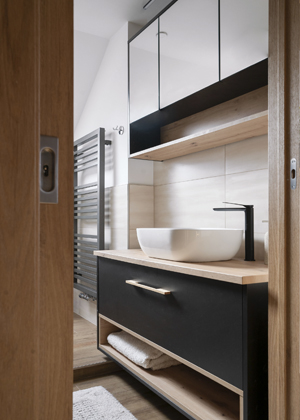 Byt je plný promyšlených detailů, které zlepšují jeho funkčnost a útulnost. Plisé a blackoutové rolety regulují denní světlo v ložnici, radiátorové kryty s průchodem vzduchu zajišťují optimální cirkulaci tepla. Tyto zdánlivé maličkosti dohromady vytvářejí domov, kde se rodina cítí skutečně dobře.