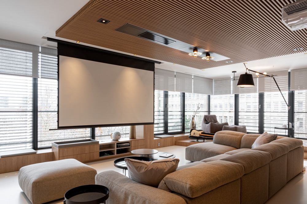 Obývací pokoj byl navržen jako multifunkční prostor s promítacím projektorem a prostorem pro klavír