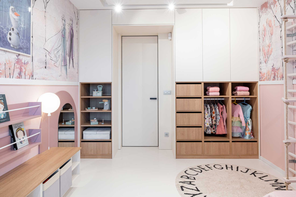 Architekti integrovali principy Montessori, které podporují samostatnost dítěte prostřednictvím snadné dostupnosti všech funkčních zón pokoje. Nábytek i úložné prostory jsou navrženy tak, aby byly intuitivně využitelné a zároveň prostor zůstal vzdušný a nezahlcující.