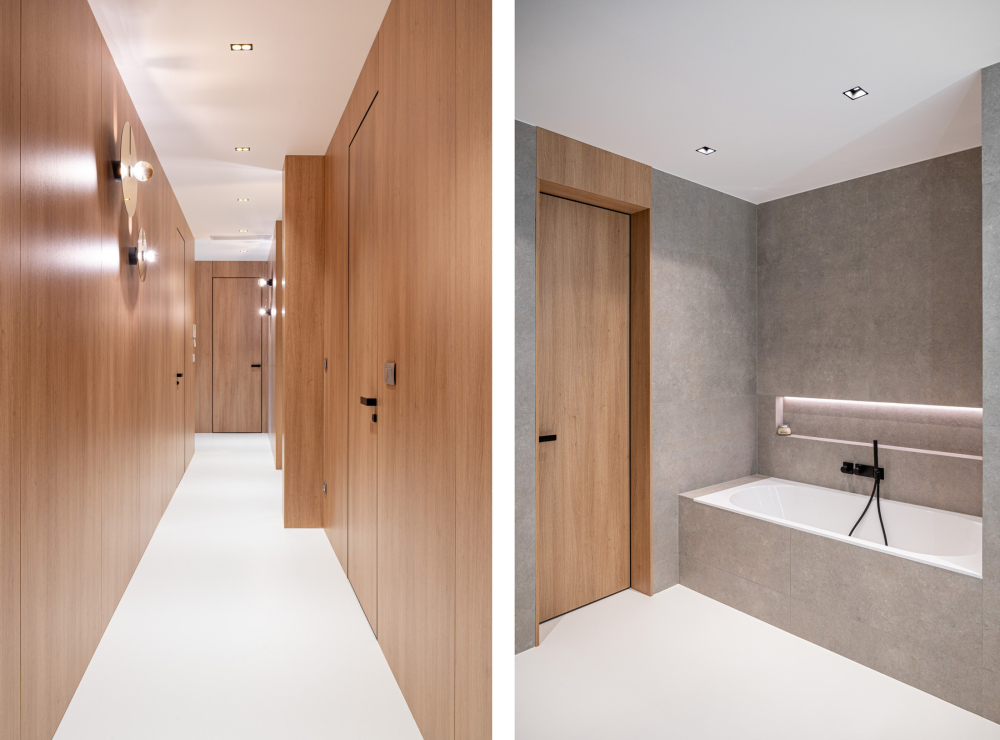 „Minimalistické pojetí interiéru se výrazně prosadilo ve všech místnostech, zejména pak v členité chodbě“, poznamenává jeden ze spoluzakladatelů ateliéru SAGA, pan Andrej Gajdoš a pokračuje: „Použili jsme sofistikovaný obkladový systém EFEKTA od firmy JAP FUTURE, který umožnil opláštění stěn ve dřevěném dekoru a zároveň včlenění dveří s nadstandardní výškou a stejným dekorem. Dveře MASTER ve skryté zárubni tak lícují s obkladem a vytvářejí čistou rovinu“.