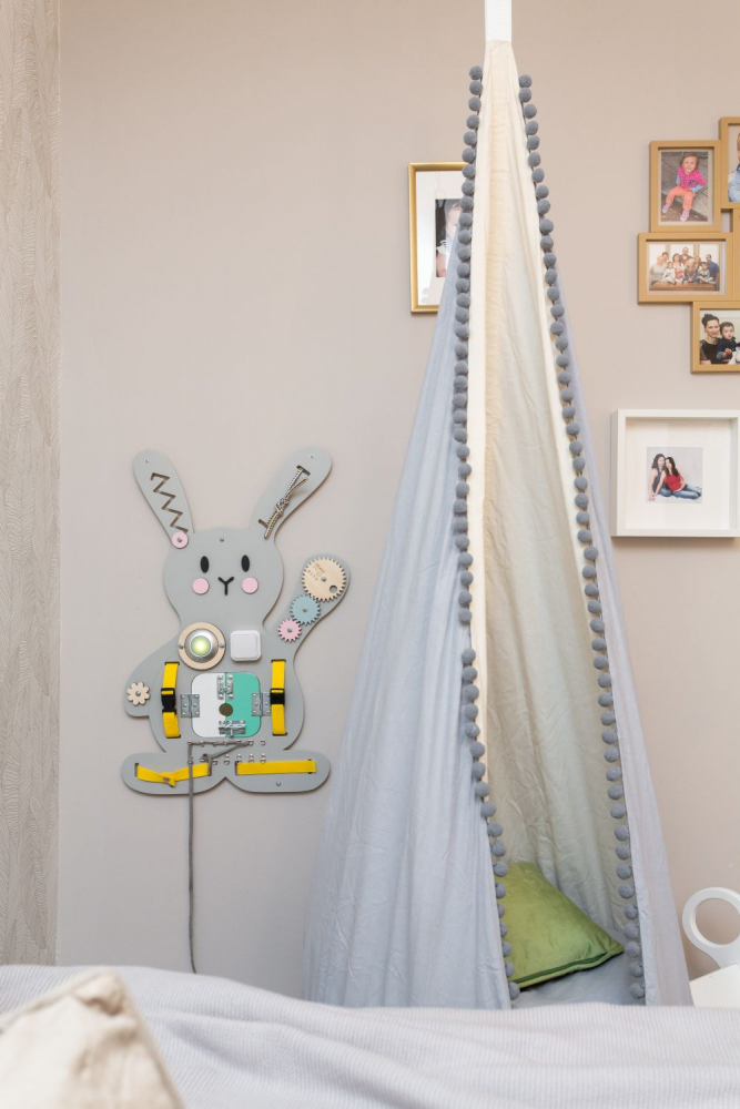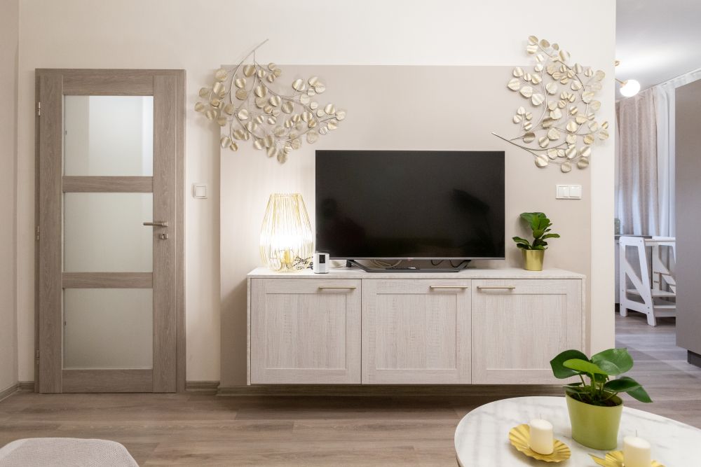 Přírodní motiv na tapetách je navržen záměrně. Jednak vyvažuje zlatý lesk, jednak má paní přírodu ráda. Listy se objevují na fototapetě v chodbě, obýváku, na nástěnných kovových dekoracích či věšáku. Styl bychom nazvali moderní, s příjemnými světlými přírodními motivy, podtržený luxusní zlatou linií.