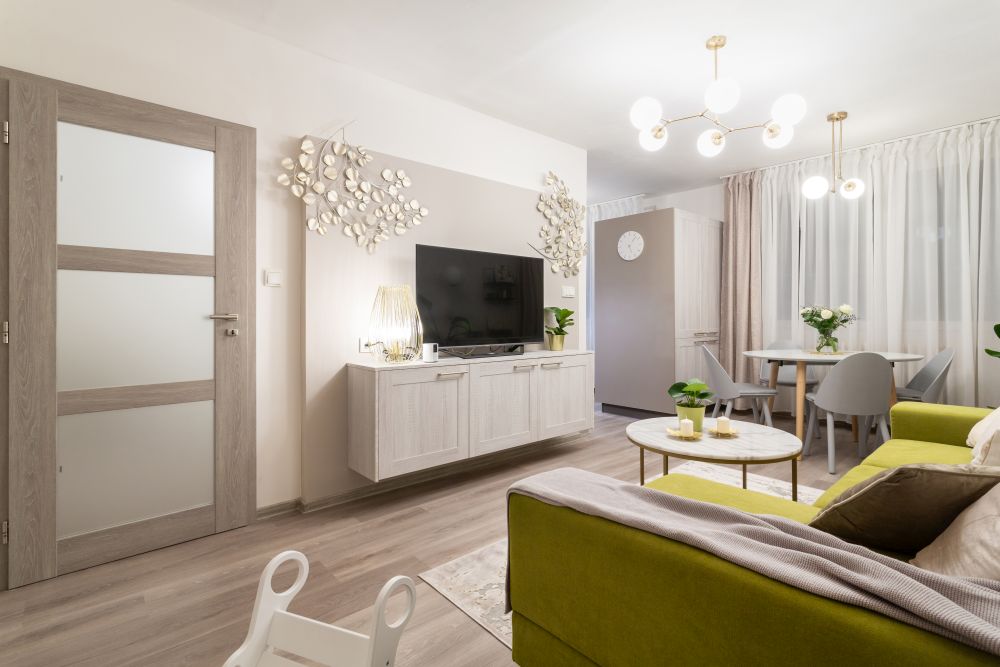 Příčky v tomto panelovém domě jsou netradičně z dřevěných desek, museli jsme tedy přistoupit k jejich posílení pomocí sádrokartonových předstěn tam, kde jsme chtěli rozvádět novou elektriku pro TV nebo instalaci pro kuchyň.