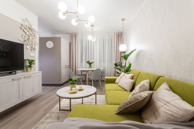 Zlatavá s přírodními motivy. Původní stav byl podle očekávání, tedy třicet let zakonzervovaný byt. Propojili jsme částečným probouráním příčky mini kuchyň s obývákem, namísto příčky jsme umístili oboustranný blok vysokých skříní na straně kuchyně s vestavnou lednicí a troubou s mikrovlnkou, na straně obýváku mělkou skříní, která nám uvolnila obývací pokoj od řady menších skříněk. Díky tomu jsme mohli umístit velkou sedací soupravu.