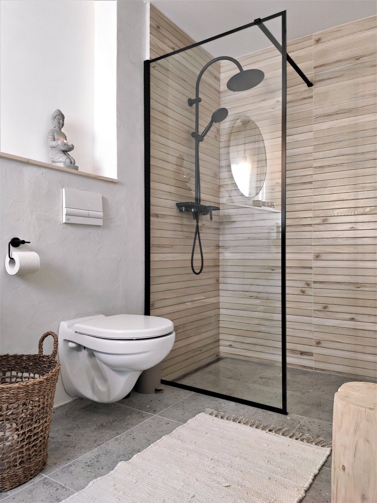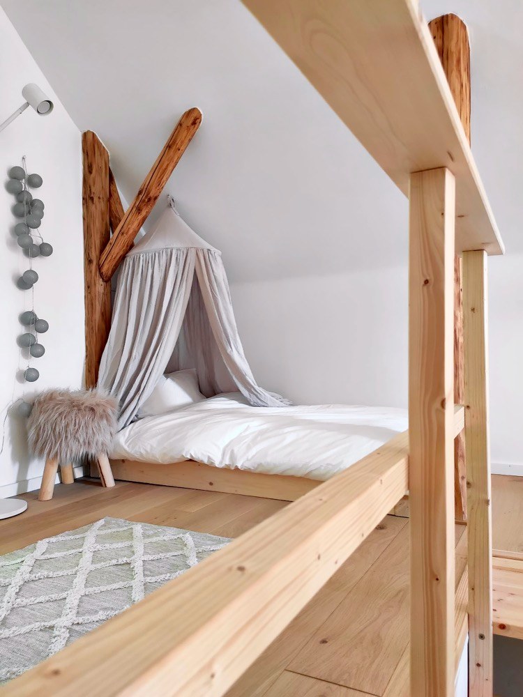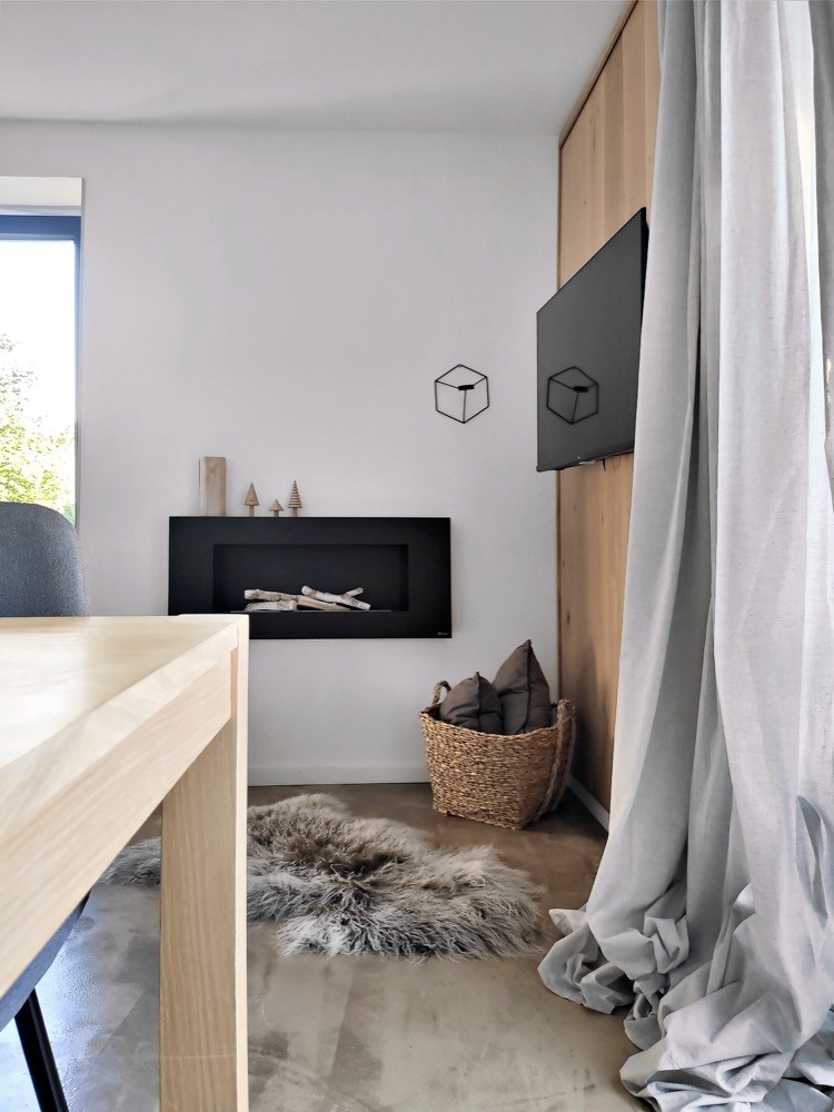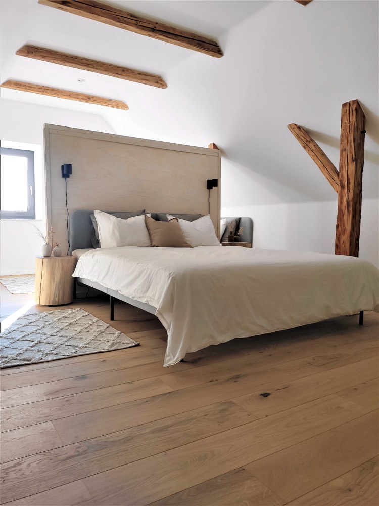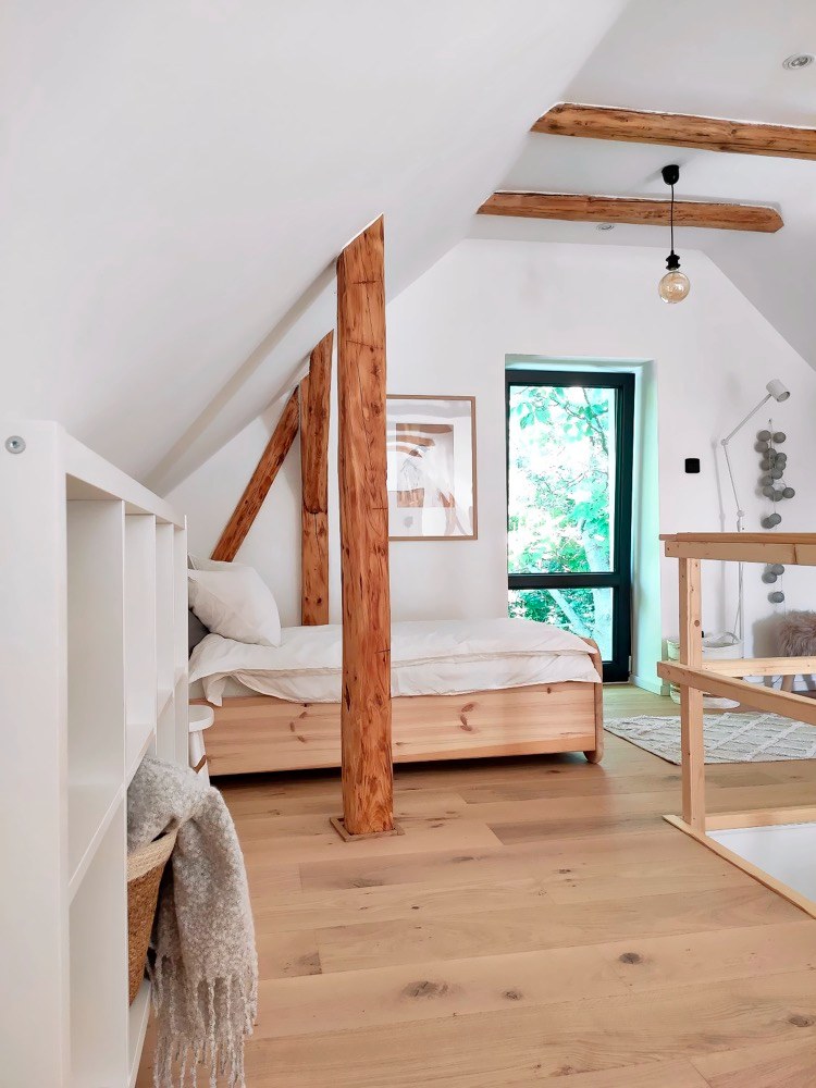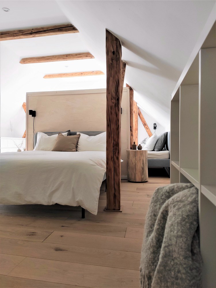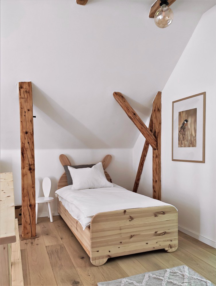 Umyvadlová deska je zase z původních půdních trámů a obklad stěny s televizí pokrývají podlahové dubové lamely, které zbyly z pokládky podkroví. Pro design interiéru zvolili skandinávský styl, který je oběma blízký, a dotvořili si ho podle svého. O velmi příjemnou atmosféru se starají nejrůznější doplňky, jimiž jsou třeba dřevěné pařezy a svícny nebo ručně malovaný obraz nad sedačkou, jehož autorkou je samotná Lucie.