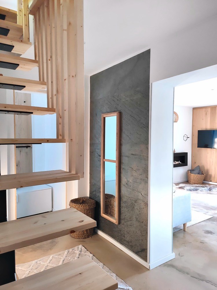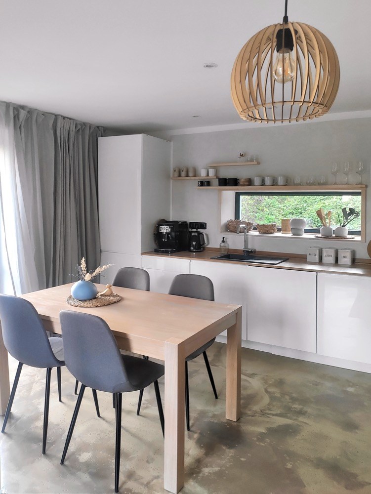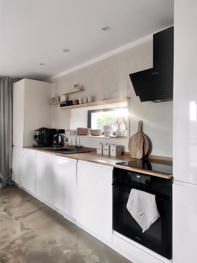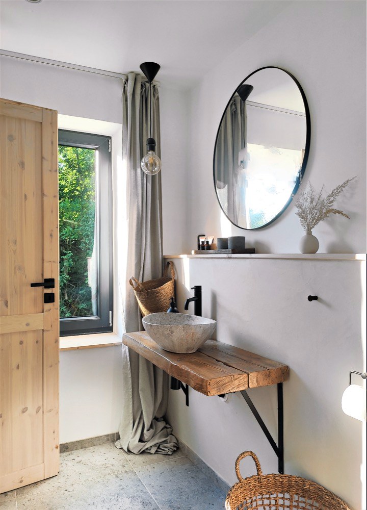 V obývací místnosti s kuchyní tedy ze stávajícího okna vzniklo francouzské, takže umožnilo vstup na nově vybudovanou terasu, z níž jde dále dojít po schodech na zahradu a do vinného sklípku ve sklepě. Nový tvar získalo také okno za kuchyňskou linkou, které se zúžilo, aby bylo možné stěnu využít na police. Tím, jak Lucie s Františkem budovali instinktivně a často metodou pokus–omyl, vznikla spousta pěkných věcí i náhodou. To se týká třeba podlahy v hlavní obytné místnosti. Tu tvoří klasická nivelační stěrka ošetřená penetrací a nakonec zalitá epoxidovou pryskyřicí, která na povrchu vytvořila originální kresbu a strukturu.