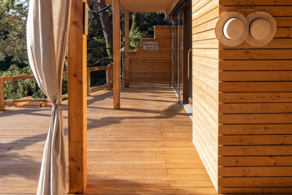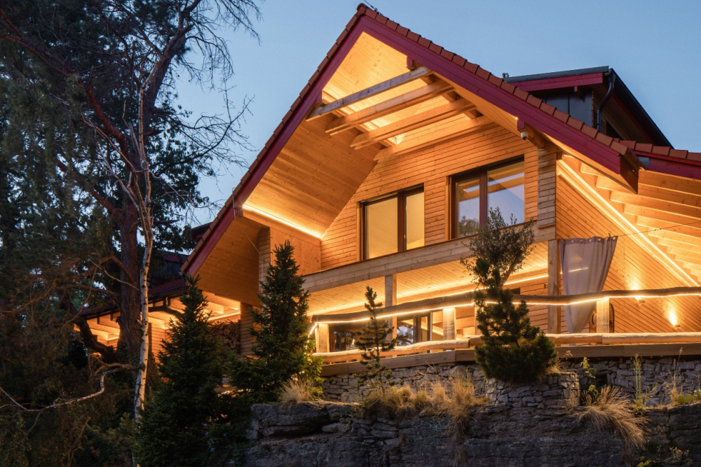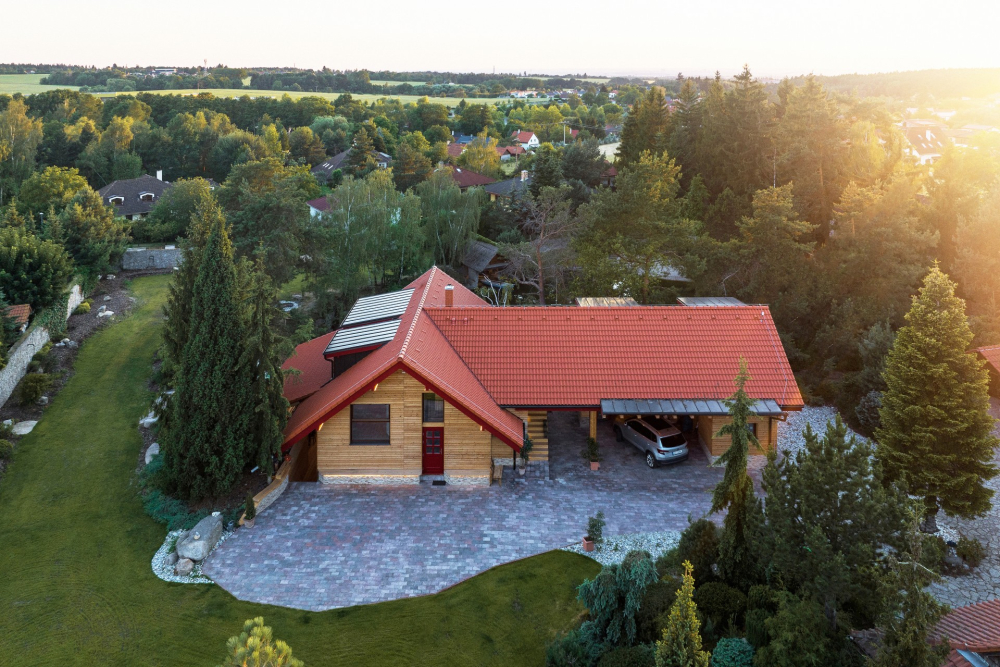 Dům je koncipovaný tak, aby byly z interiéru zachované výhledy na lom, ale aby zároveň nebyl od pláže moc výrazný. „Celá budova je stavěna do zahrady s letitými stromy, což není běžné. Klienti si navíc často nedovedou projekt z návrhu představit. Ale v tomto nám pomohly brýle pro virtuální realitu. Přesně jsme tak věděli, co kde bude. V tomto případě se jednalo hlavně o splynutí domu se zahradou,“ říká architekt Lukáš Pejsar z atelieru 3AE s.r.o. a dodává: „Na hrubé stavbě dominuje dřevo. Jedná se o masivní dřevěné panely v kombinaci s klasickou tesařskou konstrukcí, která byla použita zejména pro vybudování střechy a stropu.“ Světlé dřevo fasády skvěle kontrastuje s červenou střechou i tmavými okny. „Na dva roky jsem se tak stal přímým manažerem stavby, což mi snížilo náklady asi o 15 %. Vše jsem realizoval s kvalitními místními profesionály – firmou Veem s.r.o, Petrem Hoftou, Davidem Duškem a řada dalších… Bylo to v podstatě jednoduché: Za moje peníze jsem chtěl prostě kvalitu,“ směje se majitel. „Od začátku jsme věděli, že se zde rodí něco výjimečného. Chtěli jsme harmonickou stavbu s výraznými detaily. I proto jsme například vybrali dřevěná okna VEKRA NATURA 94 v odstínu kaštan tmavý, která se báječně hodí k sibiřskému modřínu, jímž je dům obložen,“ upřesňuje architekt Lukáš Pejsar. Celou dvoupodlažní stavbu obepíná velkorysá stometrová dřevěná terasa, jejíž součástí je venkovní kuchyně s grilem, velkým stolem pro setkávání s přáteli a vířivka pro 5 osob.
