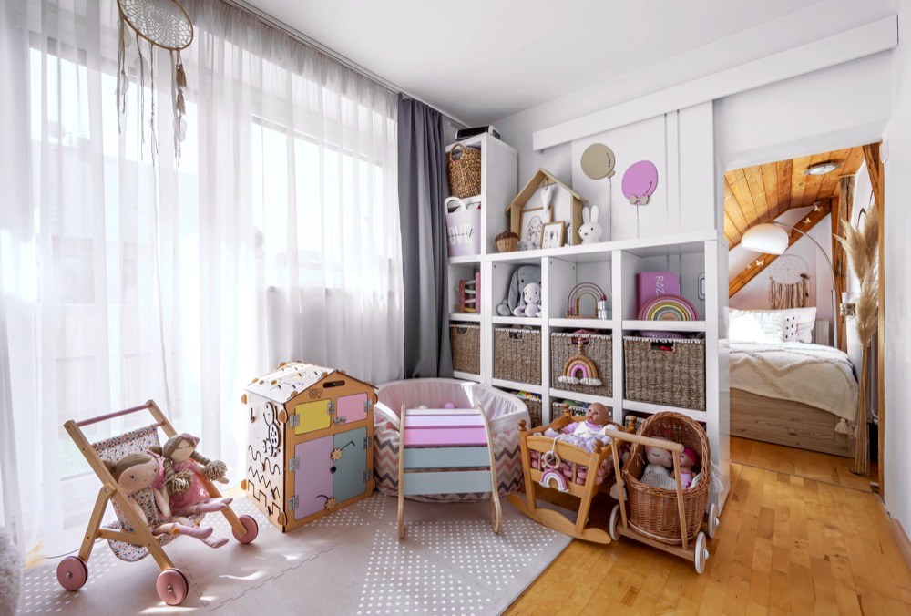 Dětský pokoj je moje největší potěšení, neustále v něm něco upravuju, předělávám a vymýšlím jeho uspořádání tak, aby se tam vešly potřebné věci a hračky. Dominují v něm především dřevěné a montessori hračky, které nakupuji na e-shopech Majastore, Agatin svět a Elis Design. Úložný prostor představují dvě velké vestavěné skříně s boxy, které jsem sama dotvořila podle svých představ.