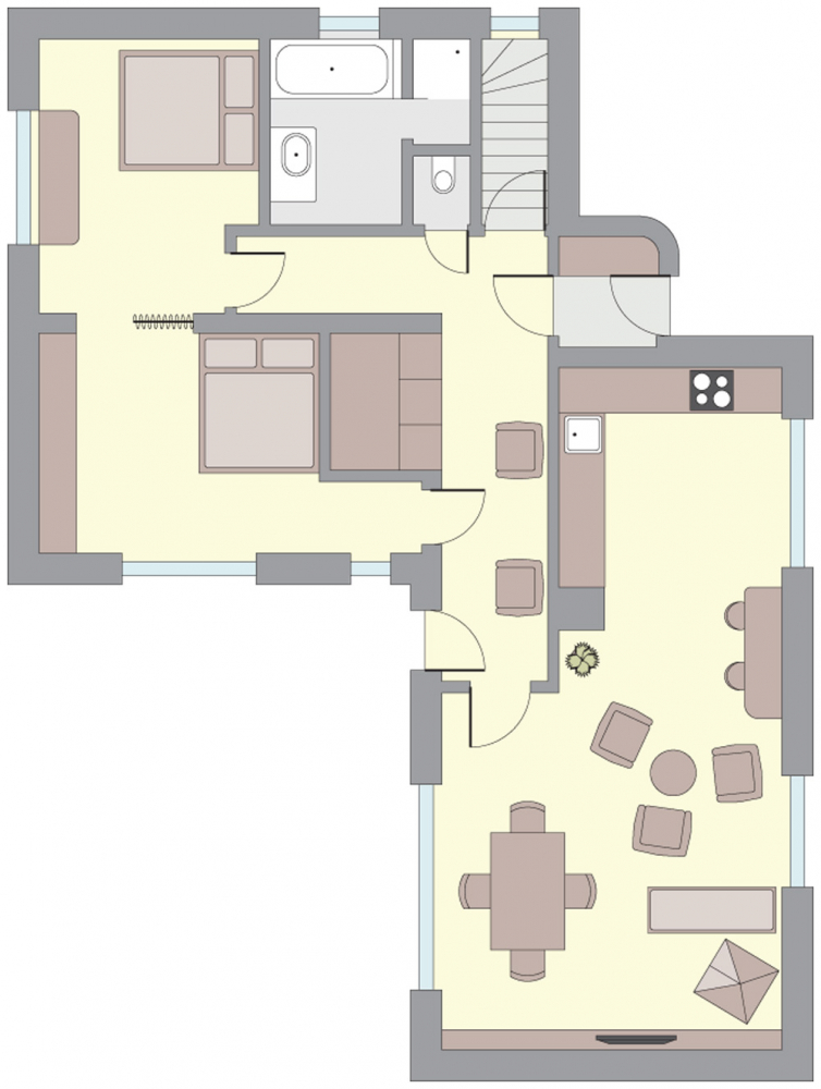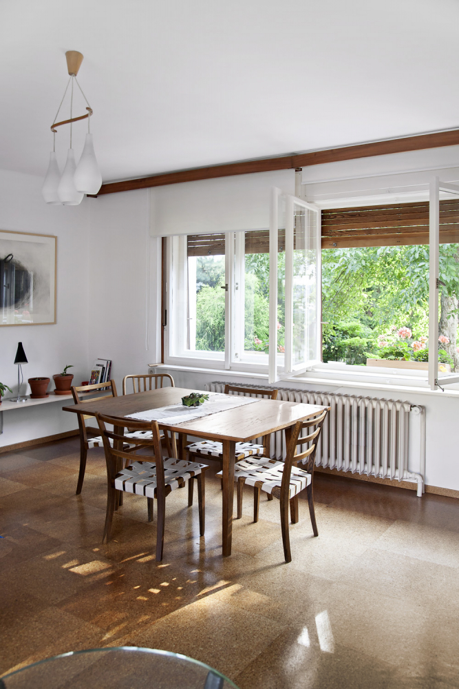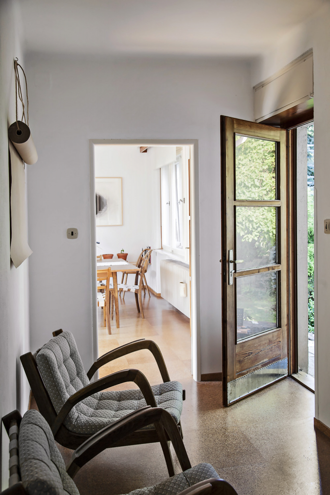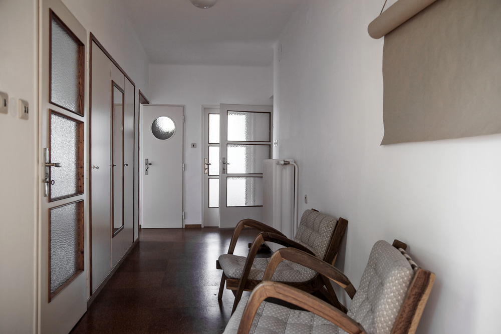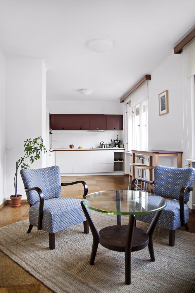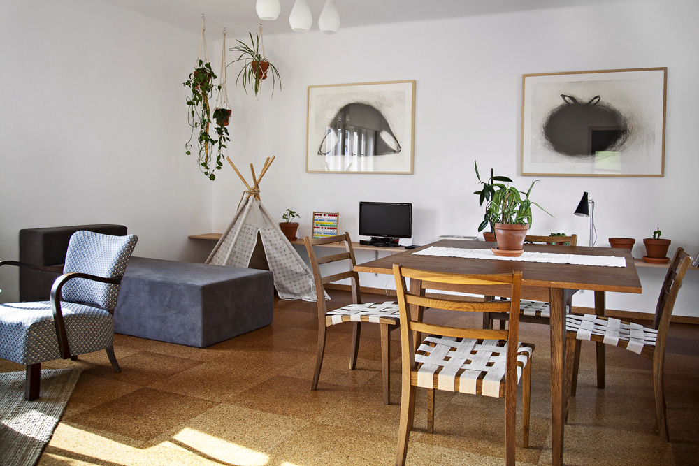 Prostor propojuje původní zbroušená korková podlaha. Na nábytek byla použita buková překližka v kombinaci s červenou probarvovanou MDF deskou, doplněnou subtilní roxorovou konstrukcí či masivním modřínovým dřevem. Nový nábytek je jen ten nejnutnější, v ložnicích s výhledem do zahrady jsou to postele a pracovní stolek, v druhém pokoji nízká úložná skříňka sloužící k posezení. Původní vestavěné skříně v hale byly opraveny a jako úložný prostor společně s komorou uprostřed dispozice postačují. Snahou bylo v maximální míře zachovat původní atmosféru a doplňovat ji jen drobnými intervencemi zajišťujícími současné potřeby.