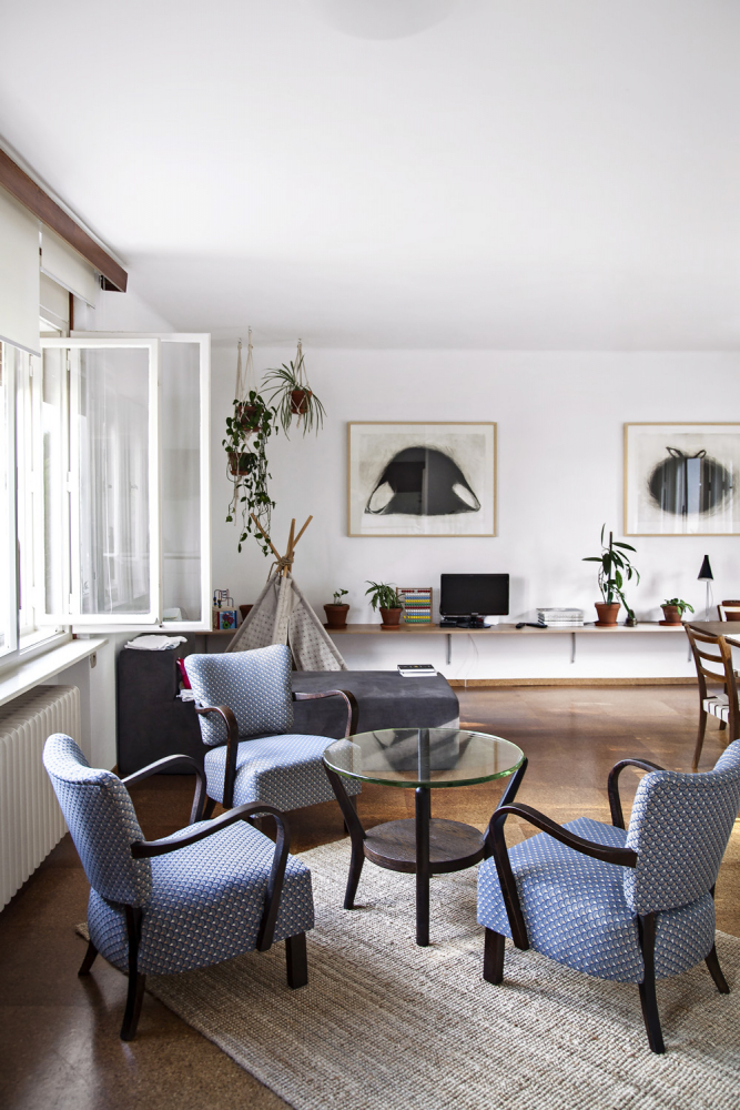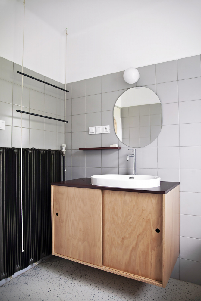 Ve dveřích do koupelny a na toaletu jsou vyříznuta kruhová okna, která tak do poměrně tmavé chodby přinášejí světlo. Koupelna je dispozičně upravena tak, že vana je nově umístěna pod oknem, umyvadlo je vložené do zavěšené skříňky vedle dveří. Na stěnách je použitý světle šedý keramický obklad, na podlaze, stejně jako v předsíni a na WC, je litá epoxidová stěrka s drobnými chipsy v modrých odstínech. Spojujícím motivem je na provázcích zavěšená tyč na ručníky, která se objevuje i v předsíni pro kabáty a v kuchyni pro utěrky. Obývacímu pokoji dominují na čelní stěně obrazy od Lenky Burdové, pod kterými je jednoduchá police na květiny a knihy. U okna do zahrady stojí původní stůl se židlemi, uprostřed místnosti je sezení s původními křesly. Prostor obývacího pokoje a kuchyně propojuje barový stůl s roxorovými židlemi.