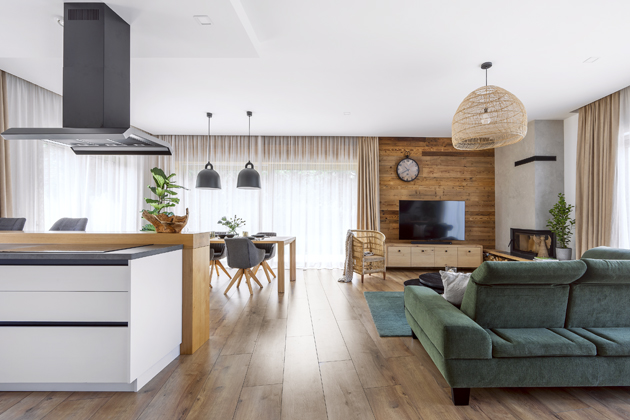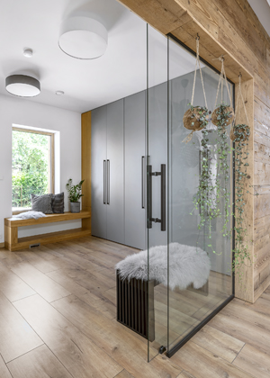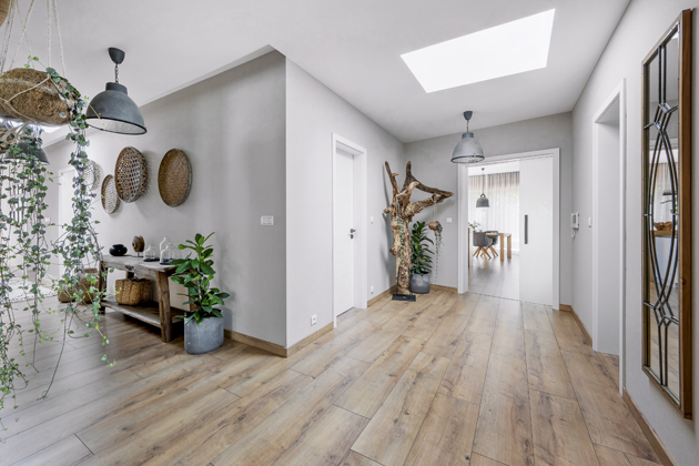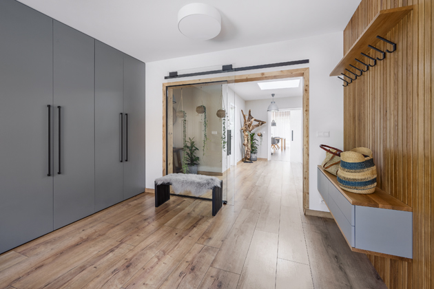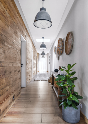 Vzhledem k tomu, že z počátku majitelka posílala designérce pro inspiraci fotky srubů, rozhodla se použít v interiéru staré vykartáčované dřevo, které vnáší do interiéru tu pravou autenticitu. Našla truhláře, který se na tento typ dřeva specializuje a nechala vyrobit fošny, které pokrývají celou stěnu dlouhé chodby a část stěny i prostoru nad velkými okny v obývacím pokoji.