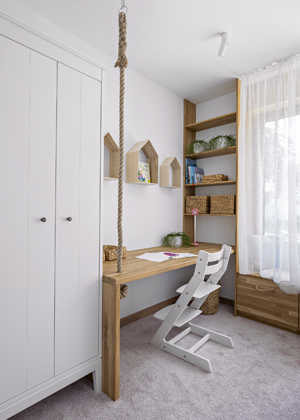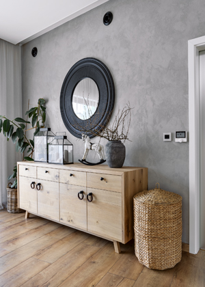 Podle návrhu designérky vznikl i konzolový stolek vyrobený z fošen s dírami, který působí, jako by ho právě přinesli z babiččiny půdy. Odlišnou barevnost dřeva vybrala designérka záměrně. K dekorování stěn zvolila netradičně proutěné podnosy, které prostor dlouhé chodby originálně zabydlují. Dalším prvkem, který předsíň pocitově zahřívá, je tapeta s dekorem režné látky. I přesto, že tapeta působí přírodně, dominantou interiéru stále zůstává dřevo. Z masivního dřeva je podle návrhů designérky vyroben i jídelní stůl se zatmelenými dírami, což vytváří krásný efekt, a také komoda v obytné části, která mě mimo jiné zaujala netradičními kruhovými úchyty. Jako kontrast k výrazným prvkům interiéru působí decentní betonová stěrka použitá na krbu a na stěně v obývací části. Stěrku designérka zvolila záměrně i z toho důvodu, že další bílá stěna by vedle bílé kuchyňské linky působila příliš chladně, což by byl přesný opak toho, co zamýšlela.