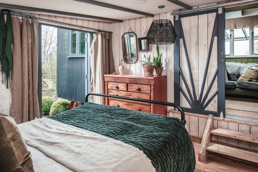Z ložnice se dá vejít francouzskými dveřmi na menší vydlážděnou terasu, kde je posezení s grilem. Okolní divoká příroda tak přirozeně prorůstá do interiéru, takže můžete lenošit v posteli či na válendě a být tak zároveň i na čerstvém přímořském vzduchu. Zařízení uvnitř Sundance je s exteriérem v dokonalé symbióze, neboť je zde využíváno přírodních materiálů a barev. Do maringotky je soustředěn hlavní obytný prostor s kuchyňskou linkou a pohovkou. Chatařskou atmosféru umocňuje dřevěné obložení stěn v zelené barvě. Stejný odstín mají i kuchyňské skříňky. Jídelnu vymezuje půlkulatý stůl u stěny. Relaxaci se můžete oddat na pohovce v druhé půlce maringotky, kde se lze v chladných dnech i ohřát u krbových kamen a pozorovat plamínky živého ohně. O tři schody níž za posuvnými dveřmi trůní černá kovová postel. Dřevěné obložení a lněné textilie v béžových odstínech dodávají ložnici hřejivý pocit, který je v drsných pobřežních podmínkách potřeba. Stejný styl udržuje i plně funkční koupelna s romantickou samostatně stojící vanou a sprchovým koutem. Dokonalou tečkou za tím vším jsou retro baterie a množství stylových doplňků.