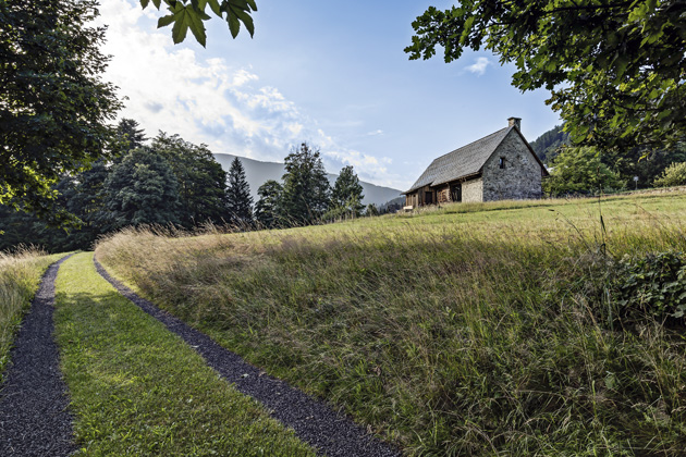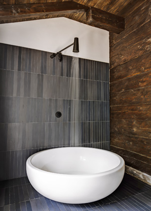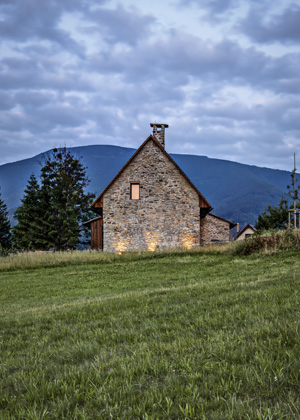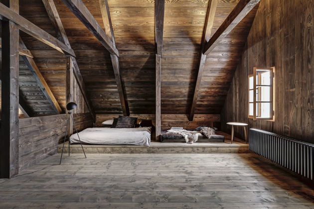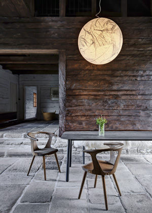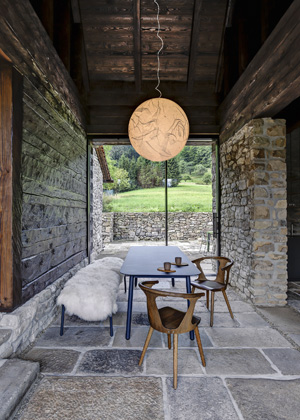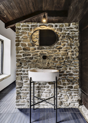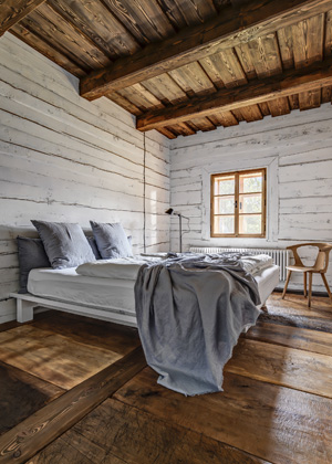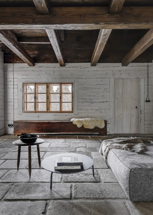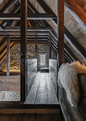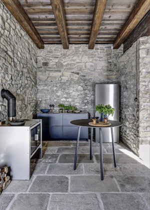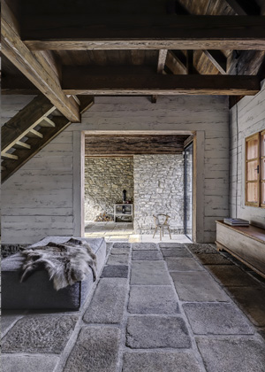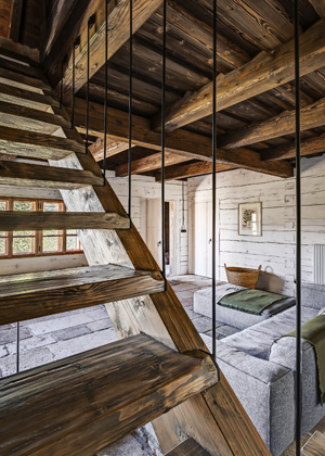 Ve snaze zachovat co největší autenticitu pokračovala majitelka i při zařizování interiéru. Zkušenosti z cestování i profese architektky a designérky jí pomáhaly s inspirací a v hledání rovnováhy mezi starým a novým. Kamenné 12 centimetrů silné desky na podlaze jsou zachráněným materiálem z jiných domů a dokonale se snoubí s moderním nábytkem v kuchyni a jídelně. Bíle natřené ručně opracované dřevěné stěny v obýváku a ložnicích zase mají připomínat vápenné nátěry používané ve starých staveních. Střecha je pokrytá modřínovými šindelem, dešťová voda stéká do dřevěných okapů.
