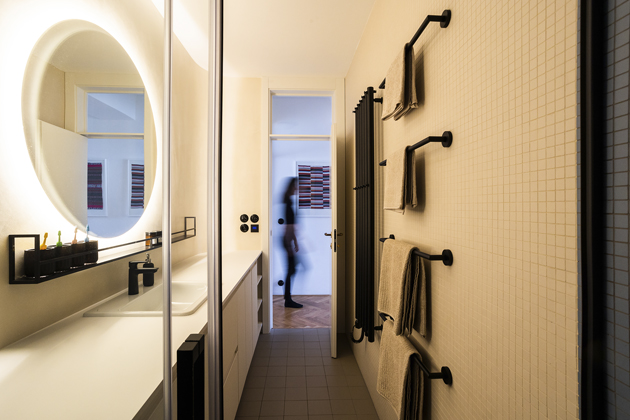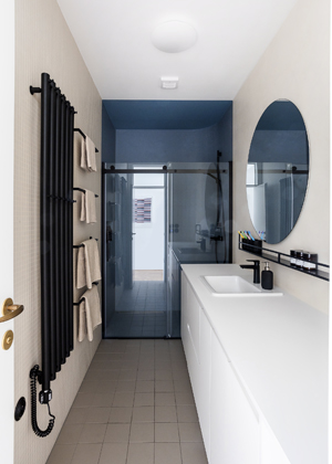 Dále je v showroomu s kováním zaujala mosaz, tak ji použili na klikách, u mini úchytek v chodbě a u konstrukce knihovny. Třešinkou na dortu jsou v interiéru černé detaily jako retro vypínače, černé prvky v koupelně, černý vstup a celá kuchyňská sestava.