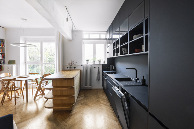 Ostatně černá kuchyň byla pro Ivu dlouhodobým snem. Aby působila vzdušnějším dojmem, sestavu protkala otevřenými skříňkami a doplnila dubovým ostrůvkem. Zbytek místnosti už je světlý a barevný a zdobí ho již zmiňovaná knihovna, retro stolek z kolekce Brusel, který je stejně jako jídelní židle památkou na Adamovy prarodiče. Pohodlí tady představuje žlutá pohovka a ušák, jenž dostala Iva od spokojených klientů.