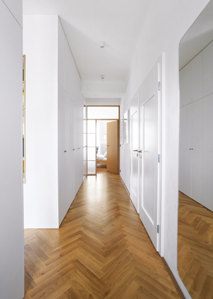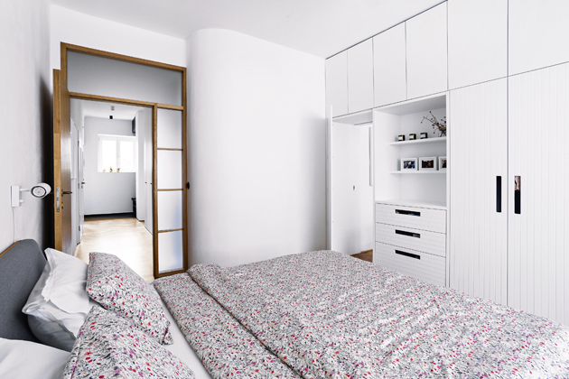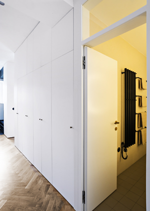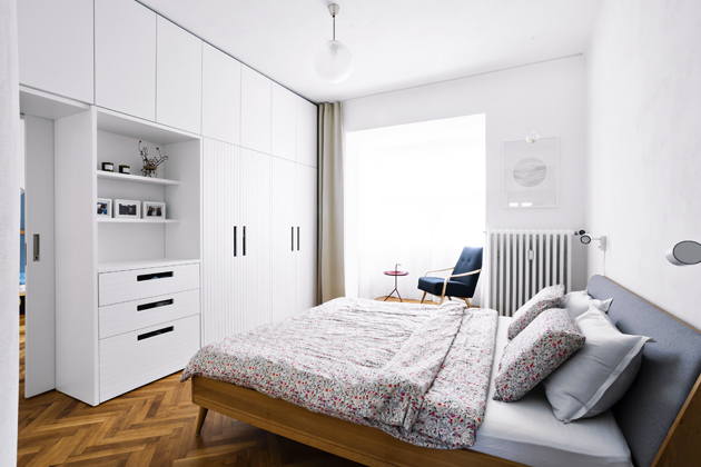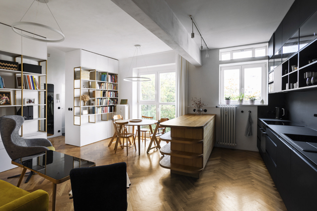Při rekonstrukci bylo zásadní upravit dispozici bytu. Chtěli co největší obytný prostor společný pro obývák s kuchyní. Proto zrušili koupelnu, do které se vcházelo z kuchyně. Tím získali velkou místnost a koupelnu přemístili k ložnici a k dětskému pokoji. Oběma zbytečně velkým místnostem trochu ubrali, aby mohla vzniknout tato nová koupelna. Dále zbourali příčku v chodbě a místo ní umístili oboustranný modul, jenž slouží z chodby jako šatna a ze strany obývacího pokoje tvoří knihovnu.