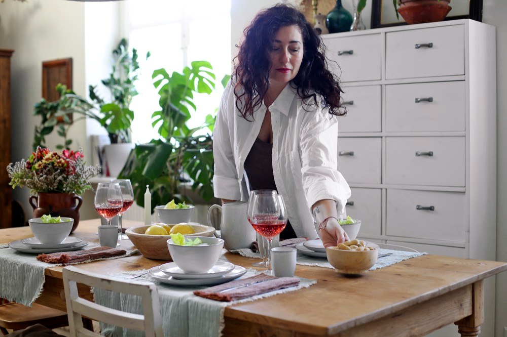 Miluji stoly bez ubrusu. Náš stůl je hodně starý, pochází z konce 19. století a koupili jsme ho přes Marketplace. Jeho dřevo je nádherné, každá rýha vypráví příběh, a proto ho nezakrývám ubrusem. Ráda používám světlé prostírání a hraji si se světlými tóny a výběrem ručně vyráběných a kvalitních doplňků. Přidám nějaké přírodní prvky a je to.