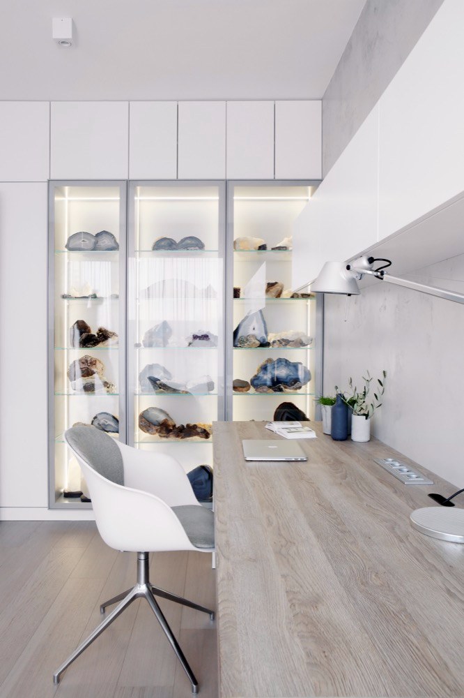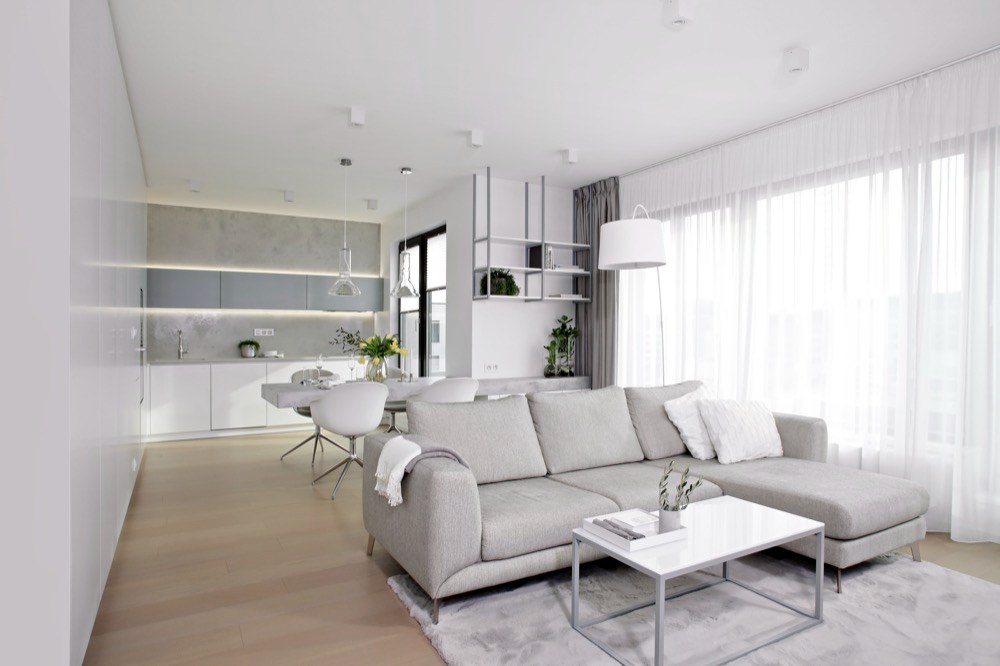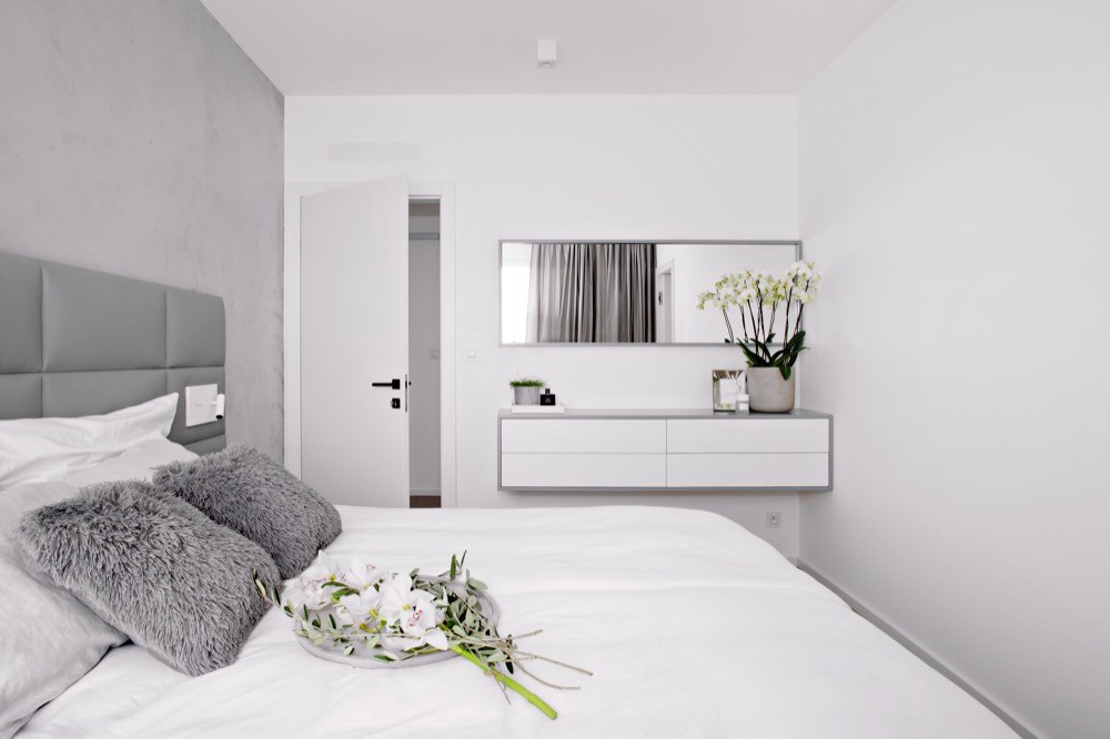 Co se týká stylu, vycházela designérka z toho, že majitelé chtějí moderní a elegantní bydlení, které bude zároveň funkční a praktické s možností snadné údržby a nabídne i dostatek úložných prostor. Eleganci zde tedy zastupuje spojení bílé a šedé barvy spolu s použitím stěrky v imitaci betonu na některých stěnách, dále bílý lakovaný nábytek, vyráběný na míru. Komfort představuje třeba opět na míru vyráběná pohodlná postel s koženým čalouněním. Do čela postele jsou instalovány LED pásky, zásuvky, vypínače a nástěnná světla pro případné čtení a dále i noční stolky. Praktickou funkci plní vestavěné skříně a další zakázkový nábytek navržený designérkou a držící jednotný styl interiéru. Velkoryse je pojatá i bílá kuchyň s dostatečně velkou pracovní deskou z Neolithu a stěnou s úložnými skříňkami a vestavěnými spotřebiči. Nepřehlédnutelným prvkem je částečně levitující jídelní stůl s železnou konstukcí a stěrkovaným povrchem. Na závěr vyjádření designérky Martiny Pištělákové: „Vybavení bytu bylo řešeno na míru potřebám klientům a našim návrhům. Naší snahou bylo vytvořit čistý, ale funkční interiér, který účelně využívá prostory celého bytu a bude svým majitelům dobře sloužit.“