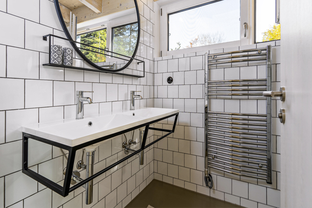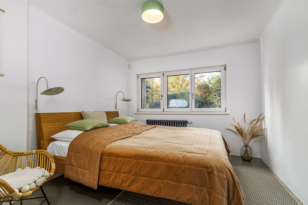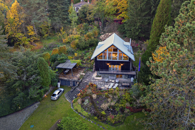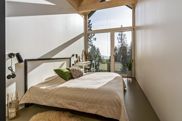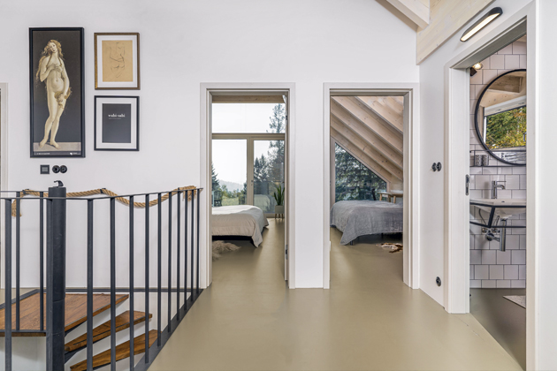 S návrhem proskleného štítu přišli majitelé, architekti ho posvětili a dali mu konkrétní podobu. Nyní obyvatelům nabízí pohled do nádherné okolní zeleně a zároveň plní praktickou funkci nositele světla. Krásně prosvětluje všechny tři ložnice otevřené do krovu, které mají rovnocenný výhled na rozlehlý pozemek.
