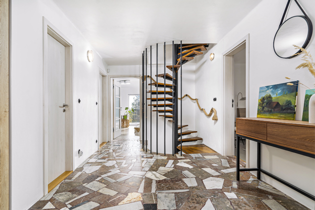 Pro tvorbu štítu byla zvolena sestava oken VEKRA, která je zvenku sladěna se šedou kamennou podestou a podobně zbarvenou střechou. Sestava je v ložnicích doplněna otočnými dveřmi ve stejném provedení, v kombinaci s předsazeným skleněným zábradlím a venkovními žaluziemi VEKRA. Ty v horkých letních měsících úspěšně snižují teplotu v ložnicích, díky čemuž obyvatelům umožňují ničím nerušený spánek, a jejich důmyslná konstrukce ve spojení s větrným čidlem stínění chrání před poškozením silným větrem.