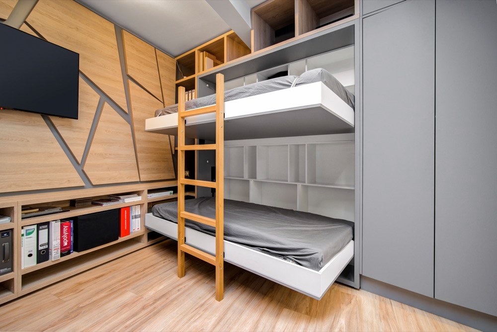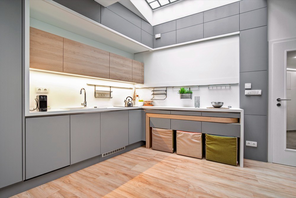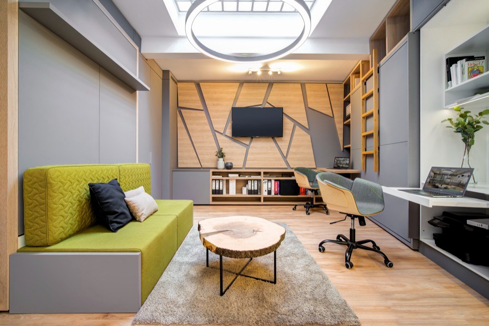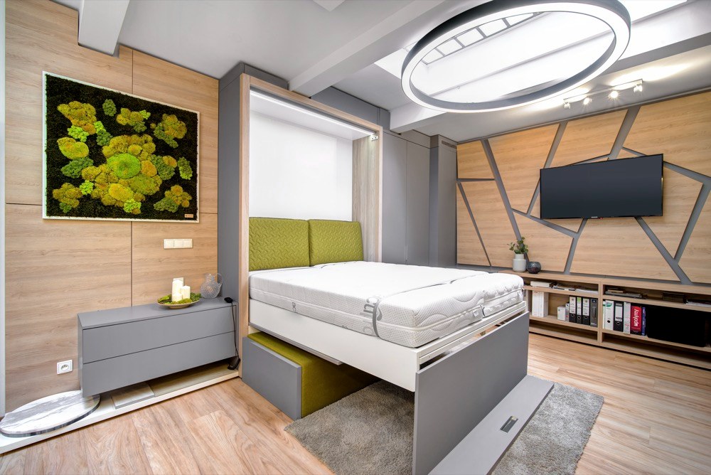 Současné ceny bytů se šplhají do nedosažitelných výšin, takže mladí lidé, kteří chtějí bydlet ve vlastním, to často řeší koupí malometrážního bytu, který se snaží zařídit tak, aby na těchto pár metrech měli vše, co potřebují. Zařídit miniaturní prostor ale vůbec není jednoduchý úkol, a tak je dobré obrátit se na architekta či bytového designéra, který vymyslí nějaké chytré řešení. To se povedlo v pražské Michli, kde na ploše pouhých 27 m2 dokázali designéři ze studia MOODEN vykouzlit komfortní bydlení pro dvě osoby i jejich přespávající návštěvy. Do garsonky naprojektovali a umístili čtyři postele, plnohodnotnou kuchyňskou linku, jídelní stůl pro čtyři lidi, dvě pracovní místa, šatnu i obývací pokoj. To vše v dokonalém souladu. Z malého bytu, který by jinak pravděpodobně nikoho nezaujal, bylo vytvořeno prostorné a multifunkční obydlí s vynikajícími standardy kvality. Nábytek byl vyráběn na míru ve spolupráci s českým výrobcem zakázkového nábytku Dřevodílo Rousínov. Díky manželské sklopné posteli, sklopné patrové posteli a vyklápěcímu stolu a dalším vysouvacím a vyklápěcím prvkům se stal prostor maximálně využitelným.