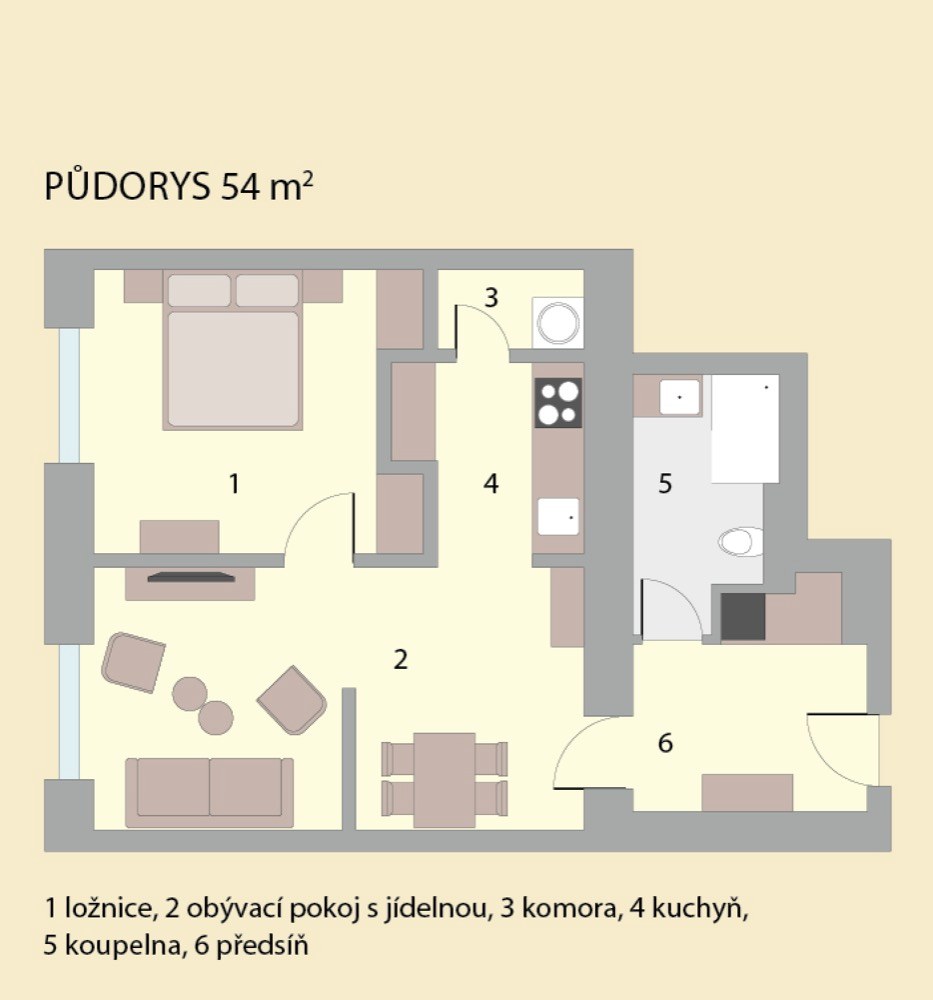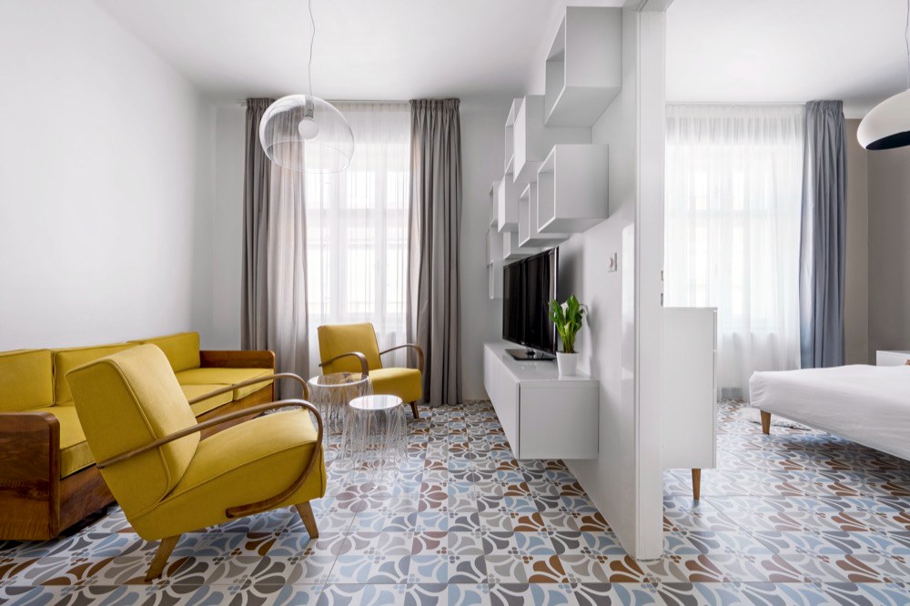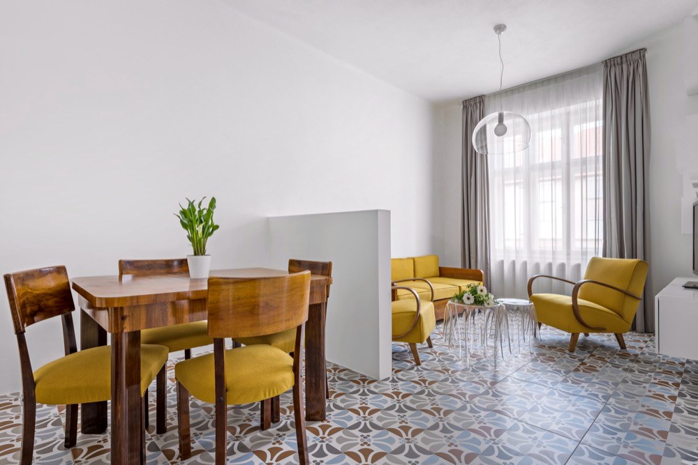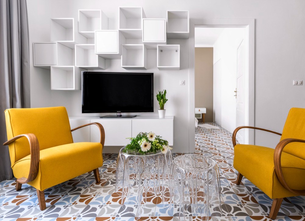 Jako základ vybrala Kristýna dlažbu s patchworkovým dekorem, kde se na smetanovém podkladu objevuje světle modrá barva s šedou a dvěma odstíny hnědé. Protože je vzor dlažby hodně výrazný, základní nábytek volila v čistě bílém odstínu. Na zakázku pak podle svých návrhů nechala u truhlářské firmy vyrobit kuchyň, skříňku pod televizi, pod umyvadlo, stěnu do předsíně a kompletní nábytek do ložnice. Jediné, co z bílého nábytku kupovala, byly bílé čtvercové moduly, které jsou na zdi nad televizí. Protože má designérka kromě moderního nábytku ráda i „staré poklady“, které shání různě po bazarech a do zásoby je nakupuje, rozhodla se i v tomto bytě oživit interiér starými designovými kousky, jako jsou křesla Halabala, pohovka a jídelní sestava ze stejné doby. Žluté čalounění tak v interiéru vytváří ten správný akcent.