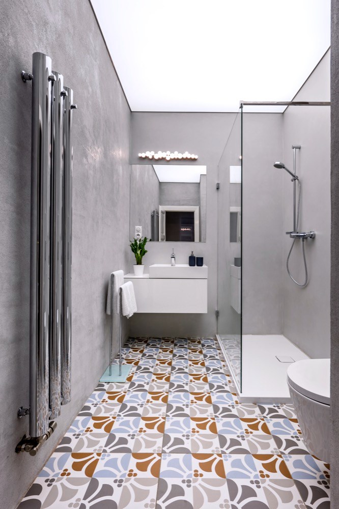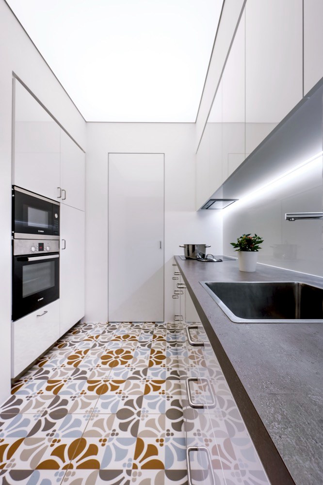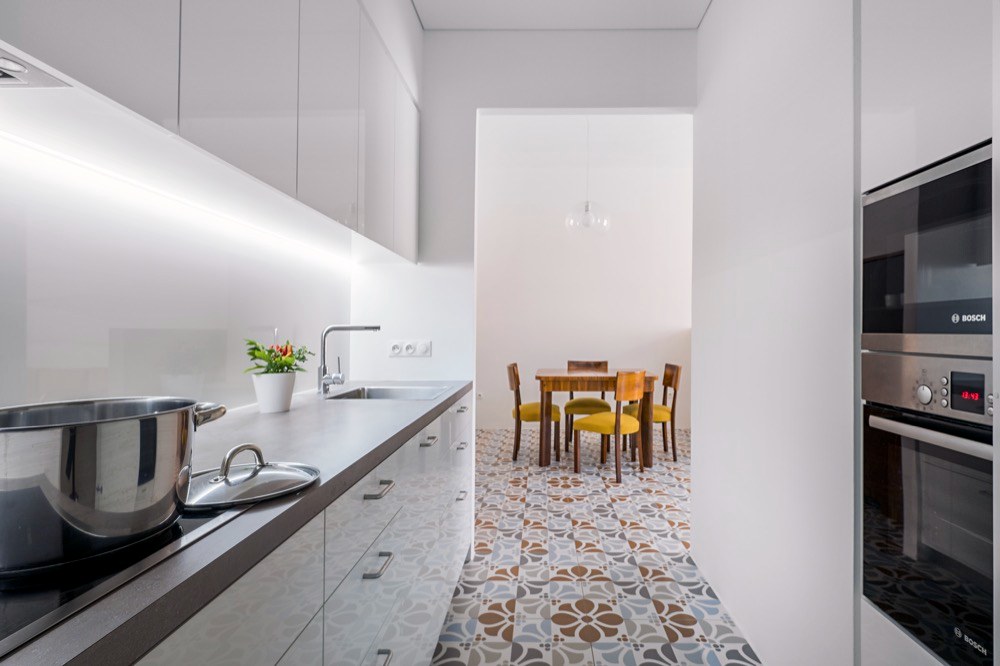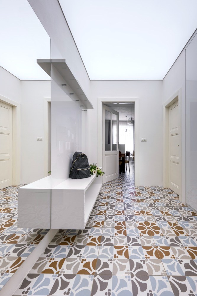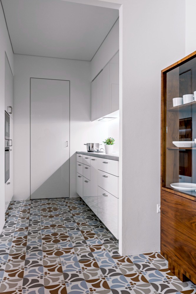 Dominantní patchworková dlažba, neutrální moderní bílý nábytek a několik retro designovek, to je zařízení, které spolu hezky souzní a jistě nabídne i příjemné bydlení.