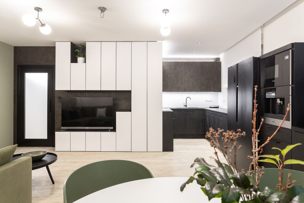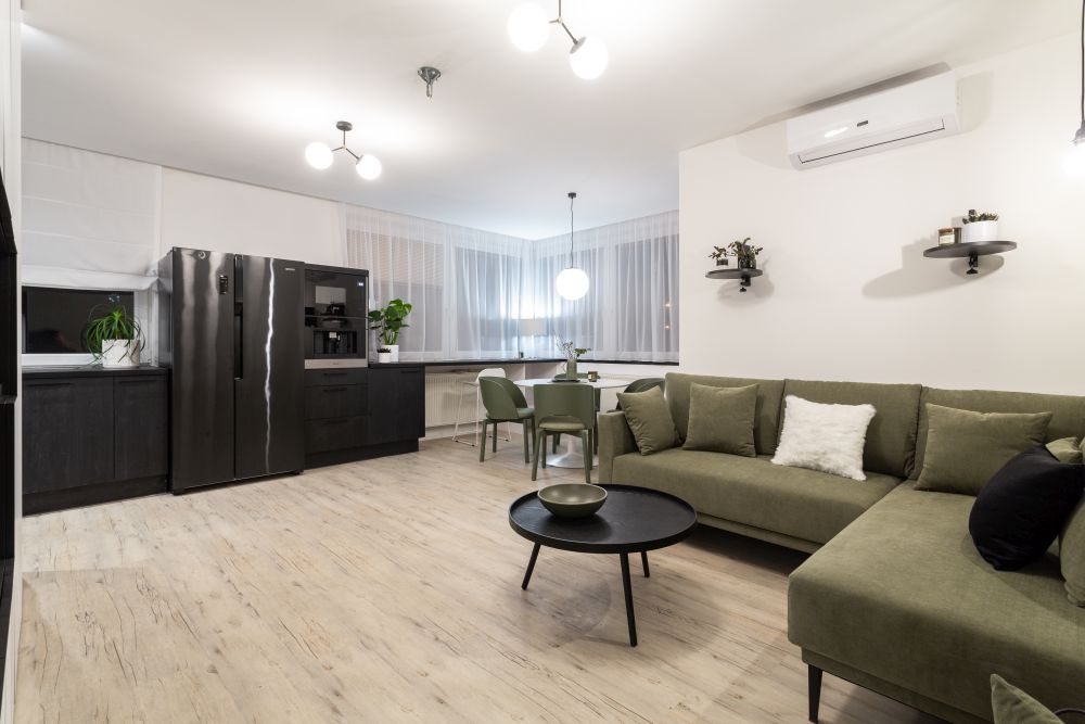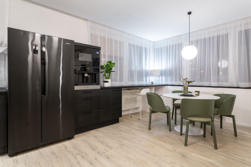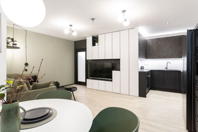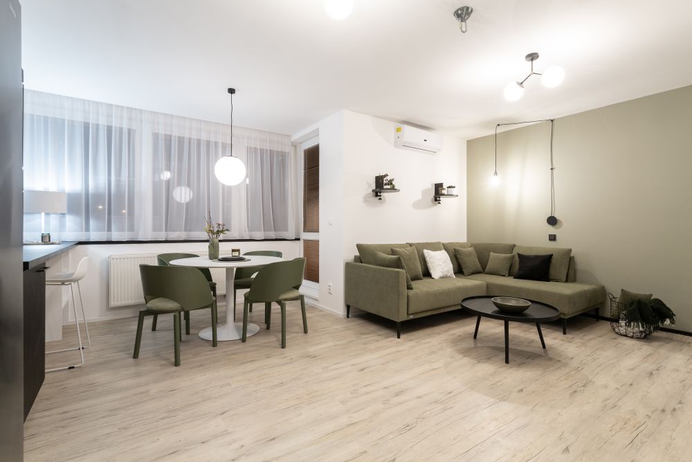 Stylově jsme se na naše poměry vcelku odvázali a použili v obýváku lahvově zelenou barvu na čalouněném nábytku. Zajímavé byly hlavně jídelní židle, které nás zaujaly na první dobrou. Zbytek pokoje, včetně kuchyně, zůstal neutrální.