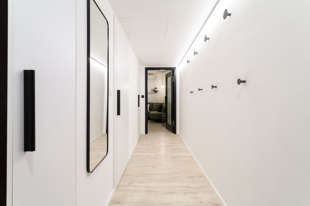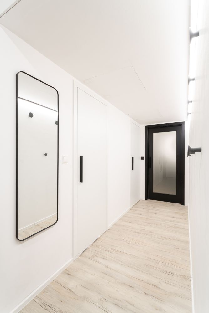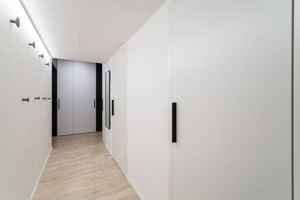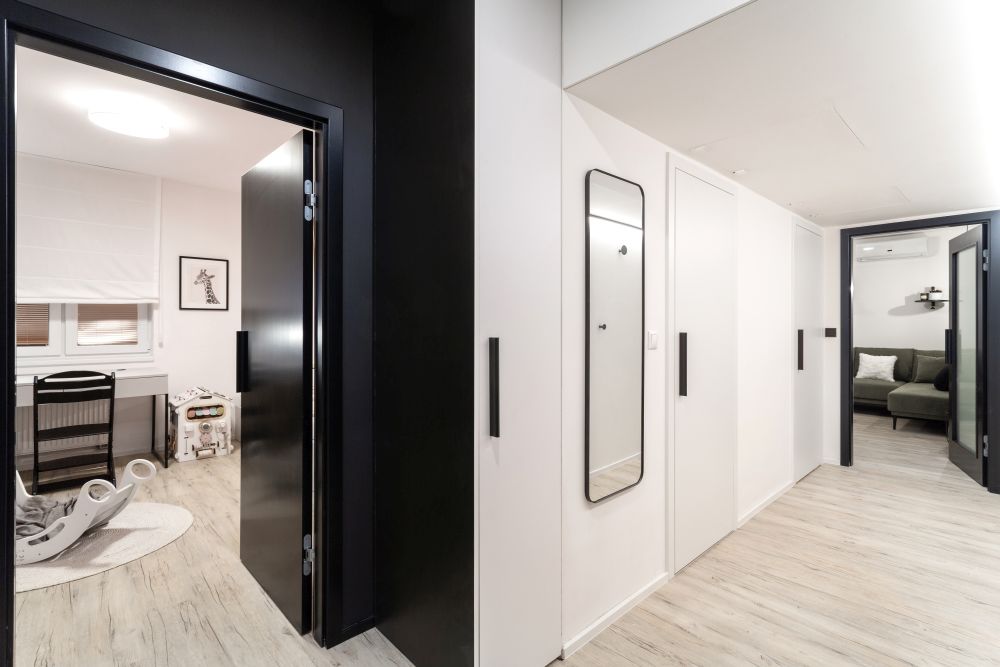 Nejtěžší pro nás bylo poprat se s prostorem dětského pokoje, ale následně také celkově s úložným prostorem. Zejména pro Evu, která neměla vlastní šatní skříň. To nás dovedlo až k dispoziční úpravě předsíně a navázané komory. V tomto místě vznikly i nově pojaté dveře, schované do truhlářské konstrukce.